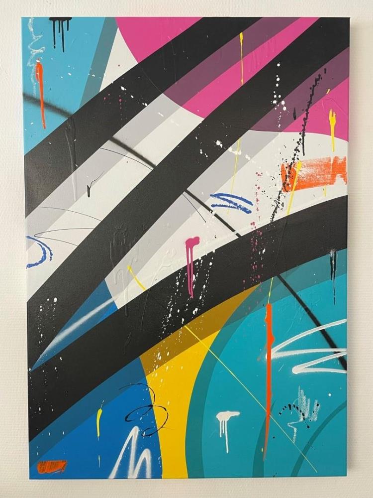 Art director, SÉBASTIEN THEYS is also a self-taught graffiti artist who lives in Nivelles. He paints an abstract and colorful universe inspired by urban art. Cartoon characters and black lines energetically break up his paintings and give a dynamic aspect to his work. The colors that regularly appear in his artworks are mainly pink, yellow and blue. Each artwork is the result of an improvisation which allows him to express himself through paint splashes and characters directly coming from his childhood. His abstract work offers the freedom of interpretation but also the possibility to lose oneself in the many colors used. He likes to think that his artworks are a journey inside himself, where the black line represents a timeline leaving many souvenirs behind.