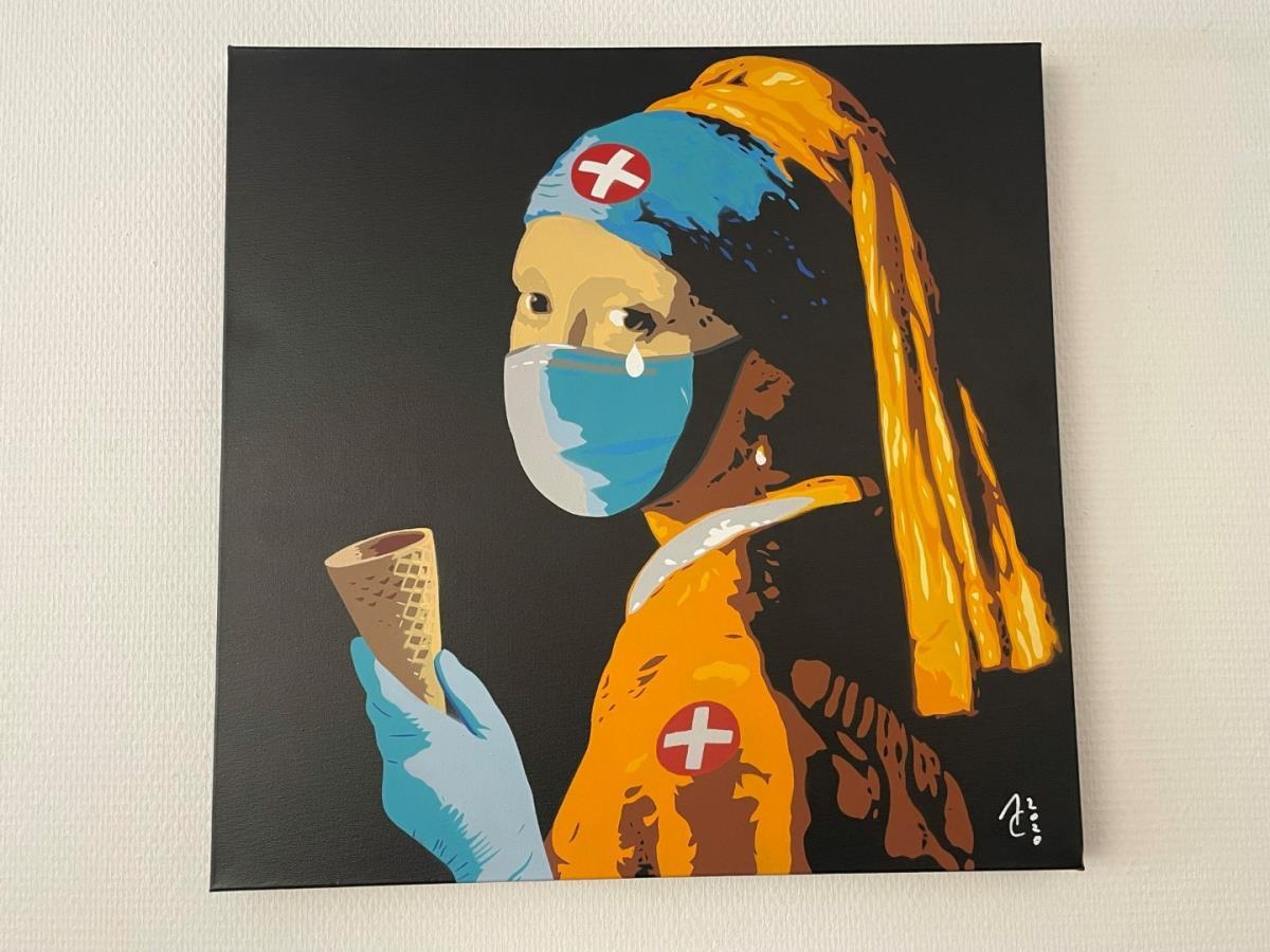 Het contrast tussen smeekbedes uit de zorgindustrie tijdens de piek van de coronacrisis terwijl elders ellenlange rijen zorgeloze mensen aanschuiven voor een ijsje. Parodie op 'Meisje met de parel' van Vermeer.