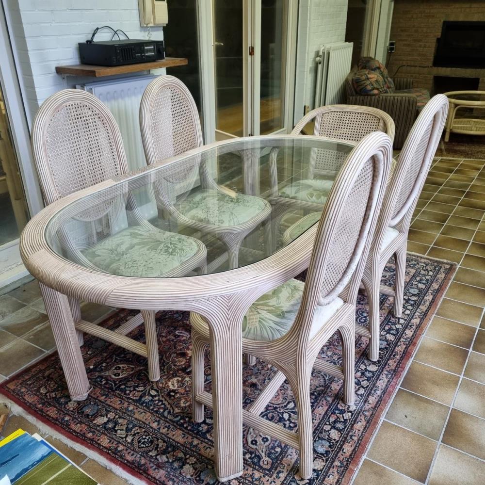 Numéro du lot 108: Rotanlook tafel met 5 stoelen