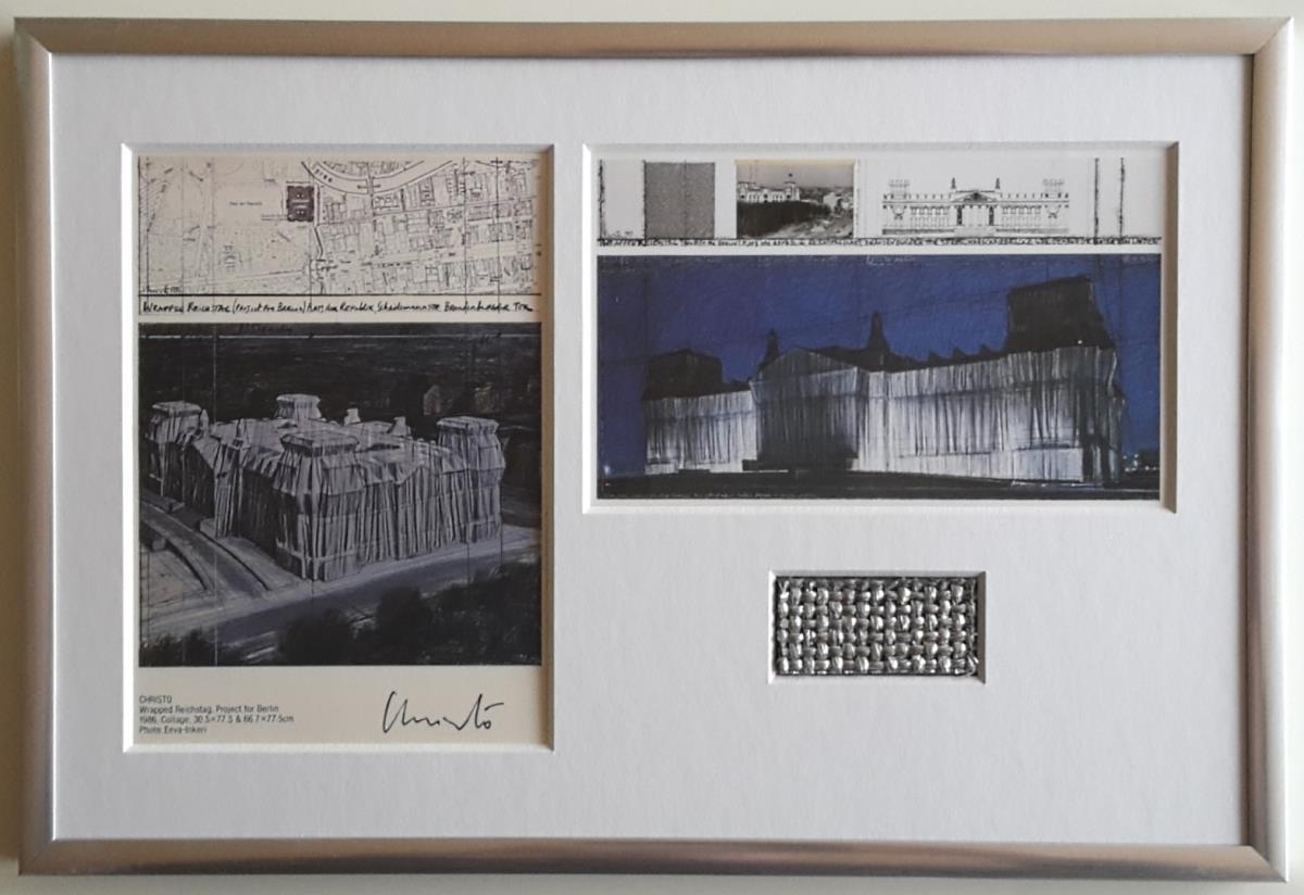 Christo | Wrapped Reichstag, Project for Berlin, 1971-95 | 2 artcards waarvan 1 gesigneerd door Christo + origineel stofstuk | Ingelijst in glanzend zilveren composiet frame met echt glas | Achteraan afgetapet in grijs, steun en zaagtandhanger |Afmetingen lijst: 31 x 21 x 1,4 cm |Uniek stuk |Dit werk wordt door de eigenaar opgestuurd, verzendingskosten België: € 18, Nederland/Frankrijk / Duitsland: €25