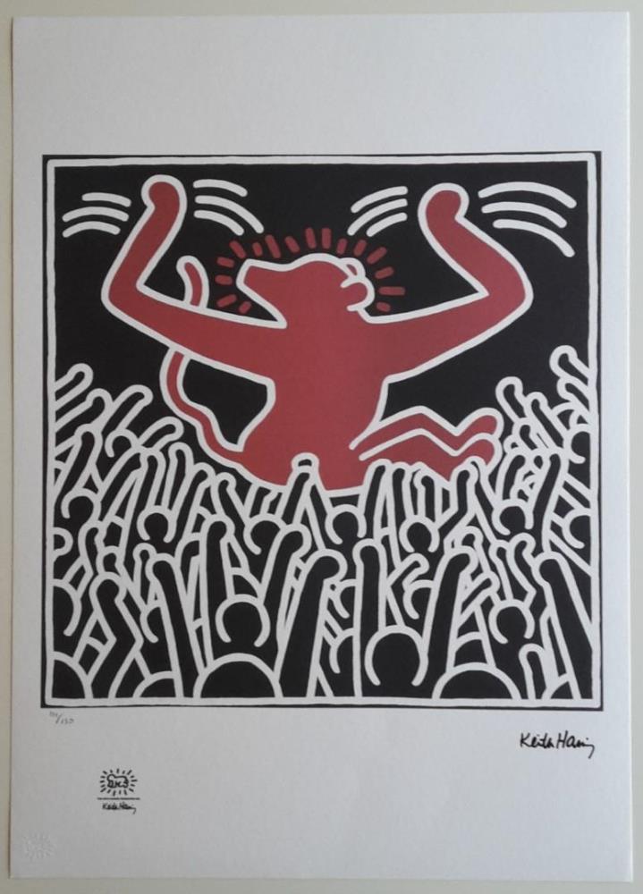 Keith Haring (After) | ‘The Monkey As Golden Calf’ naar het origineel uit 1985 | Lithografie op zwaar papier, gesigneerd in de plaat en genummerd in potlood 111/150 |Gecertificeerd met een reliëfstempel en inktstempel van 'The Keith Haring Foundation' |50*70 cm |Dit werk wordt door de eigenaar opgestuurd, verzendingskosten België: € 18, Nederland/Frankrijk / Duitsland: €25
