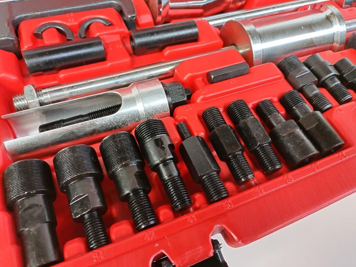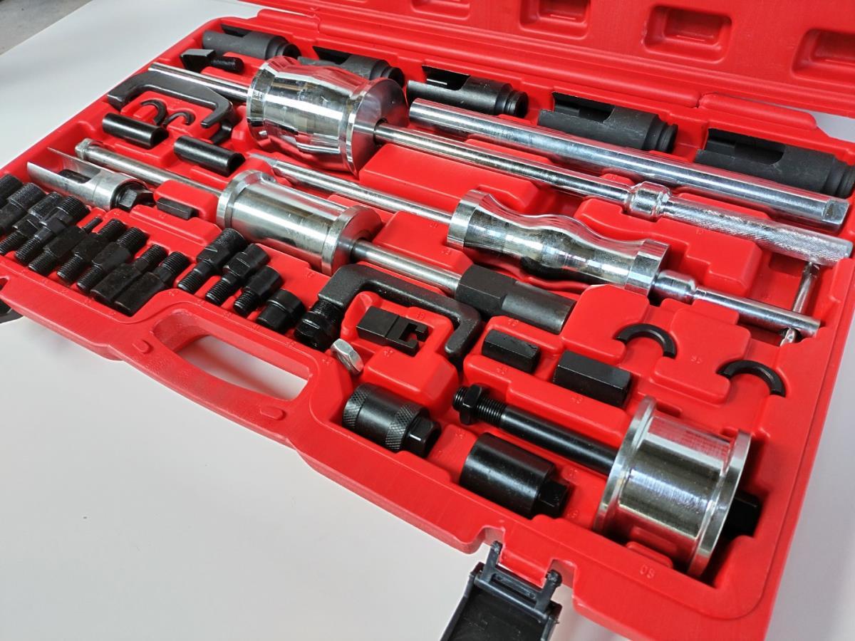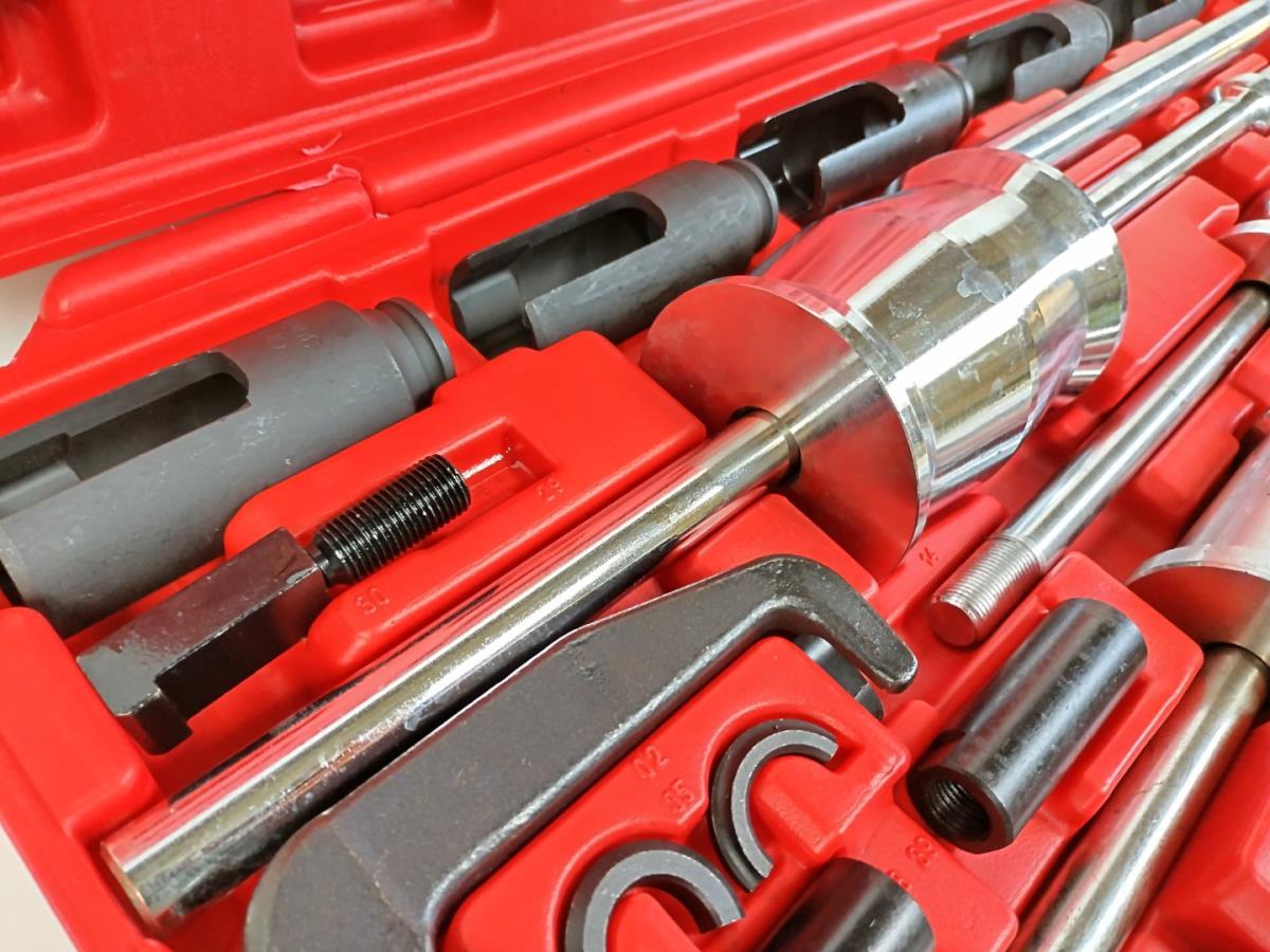 3x slangtrekker: 1.6kg/160mm, 2.7kg/460mm, 5.1/600mm. Trekvorken met openingen: 13.7x18mm, 105mm lang, 12.7x19mm, 130mm lang. Slotted 1/2" Drive sockets, 6 pt, 100mm long. 25/27/28/29/30mm. -Sleeve design injector extractor with supporting shells, outer diameter 35mm, internal diameter 29mm, M17x1.0 spindle. -Pulling adapter with external thread M27x1.0(3pcs) and M25x1.0. -Pulling adapter with internal thread M27x1.0(3pcs). Sliding hammer adapter for inner, outer and claw extractor.