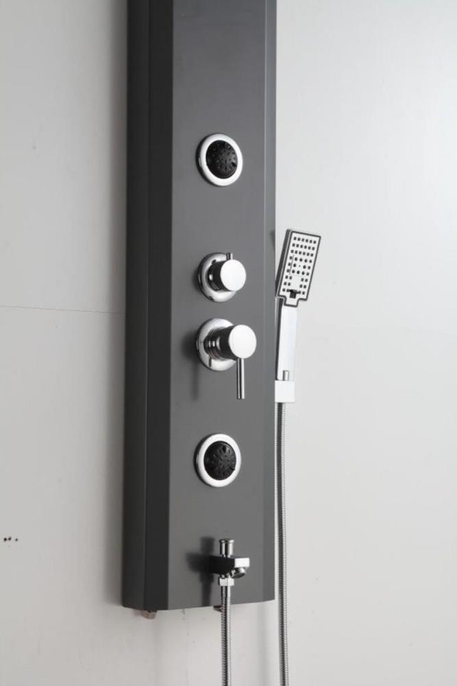 1x rvs douchepaneel, model: 5592 zwart matt, functies: 1xbodyjets, 1xhoofddouche, 1xhanddouche, 1x voetwaterval, mengkraan, flexibele slang 150cm, afm. 140x22cm (hxb), dit betreft een nieuw product in doos.