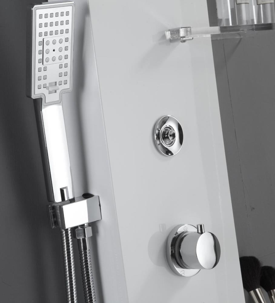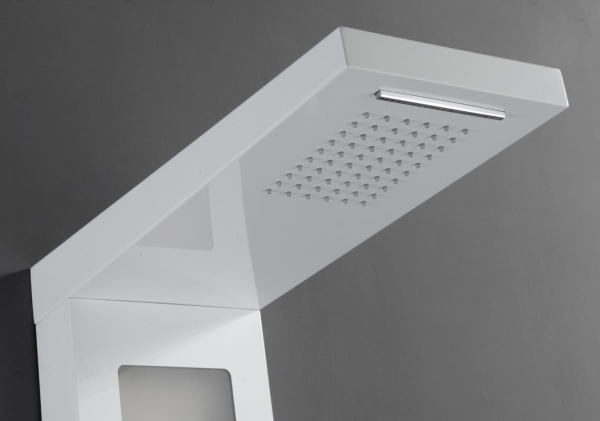 1x rvs douchepaneel met LED, model: 5519 wit matt , functies: 1xbodyjets, 1xhoofddouche, 1xhanddouche, 1x voetwaterval, 1x hoofdwaterval, mengkraan, extra schab voor shampoo, flexibele slang 150cm, afm. 150x22cm (hxb), dit betreft een nieuw product in doos.