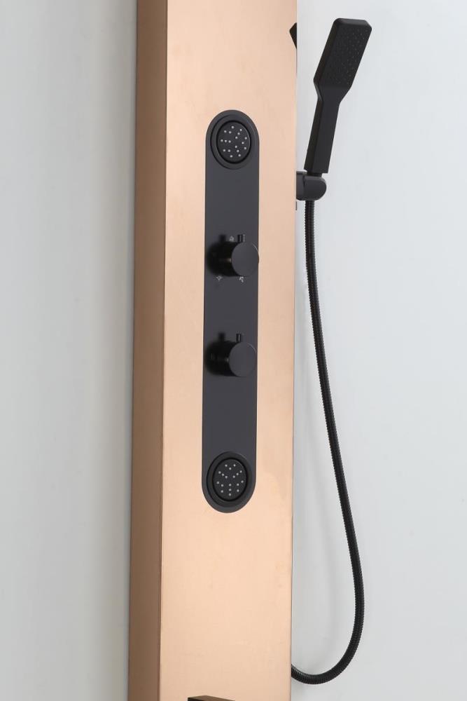 1x rvs douchepaneel, model: 5618 rose goud met zwarte details , functies: 1xbodyjets, 1xhoofddouche, 1xhanddouche, 1x voetwaterval, 1x hoofdwaterval, mengkraan, flexibele slang 150cm, afm. 150x22cm (hxb), dit betreft een nieuw product in doos.