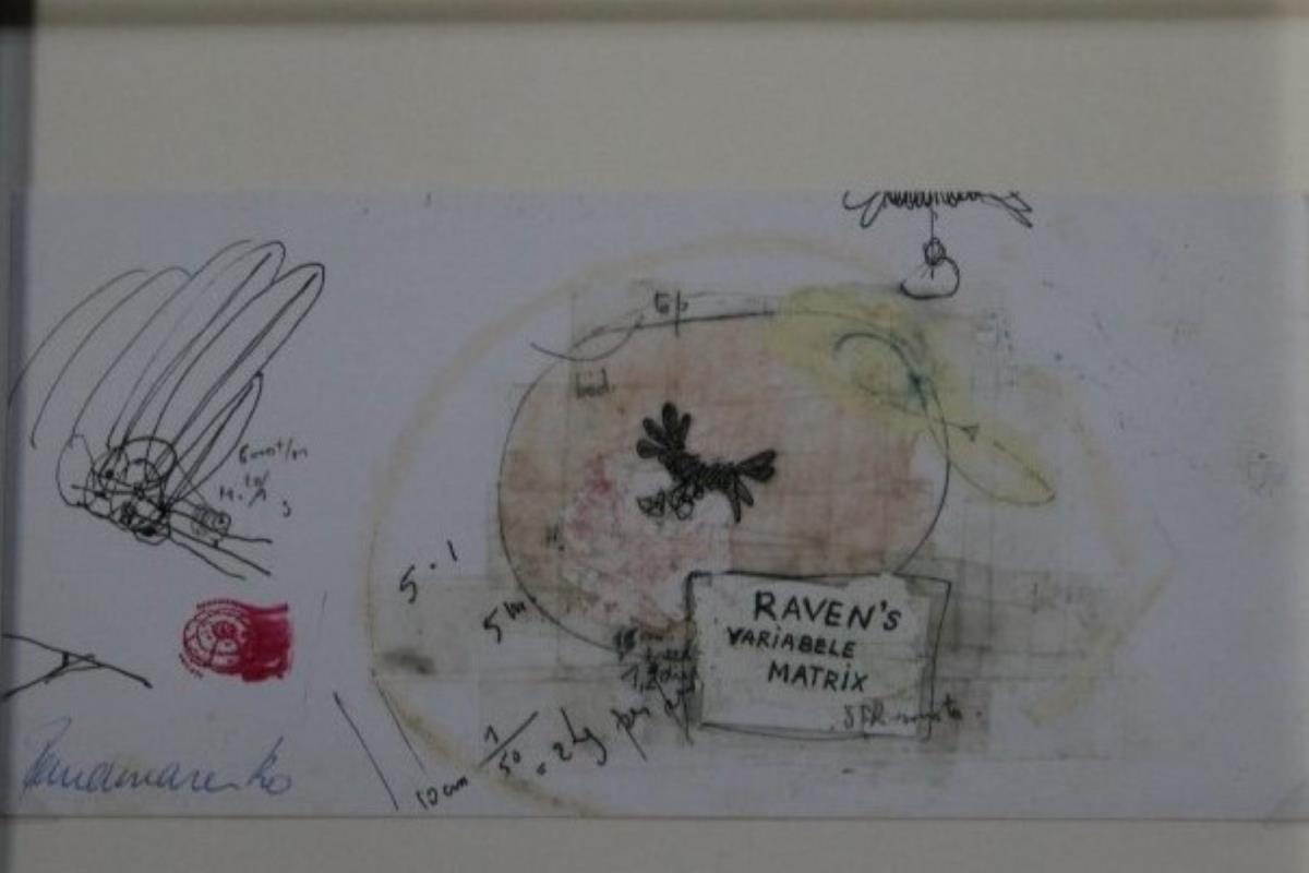 Raven's matrix - Artcard - uitnodiging met glansdruk (gelakt) - zeldzaam wegens gestempeld met Panamarenko's Nailati Efil stempel - Handsignering in blauwe balpen linksonder - in kader 30x21