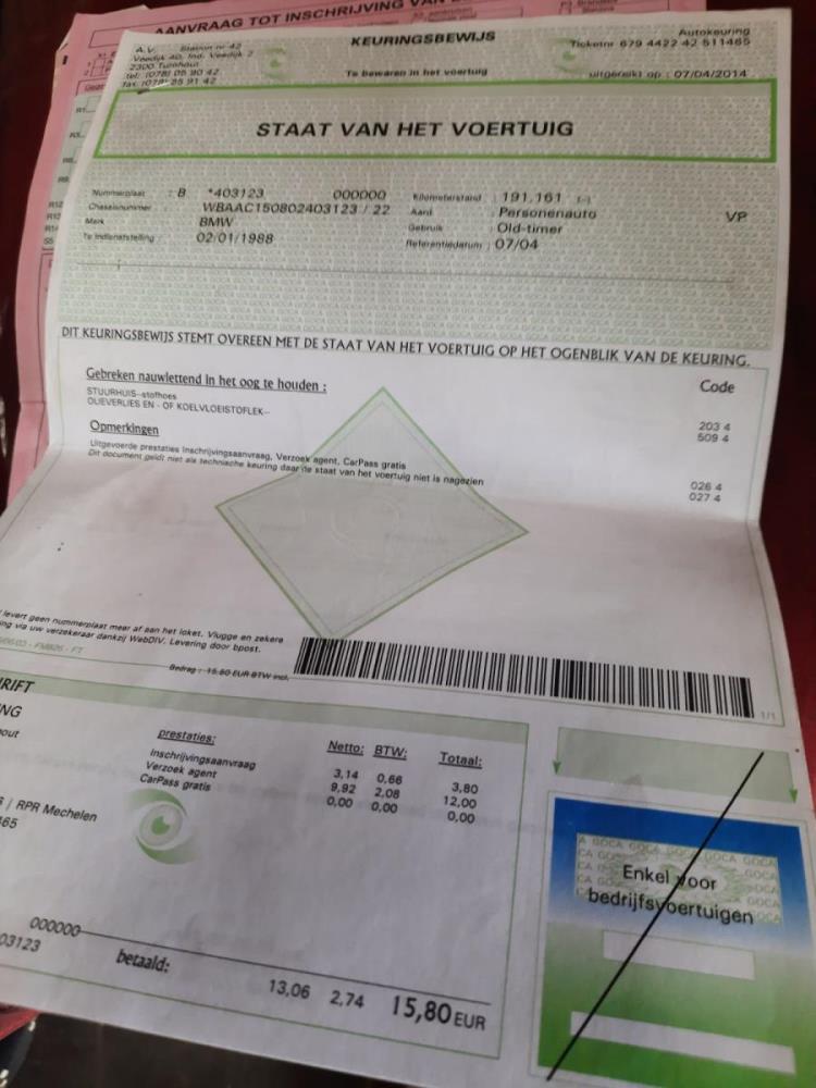 1ste inschrijving: 02/01/1988 Brandstof: benzine Chassis nr.: WBAAC150802403123 Afgelezen tellerstand: 191306km Boorddocumenten: aanvraag tot inschrijving, nederlands kentekenbewijs, keuringsattest, Sleutels: 1