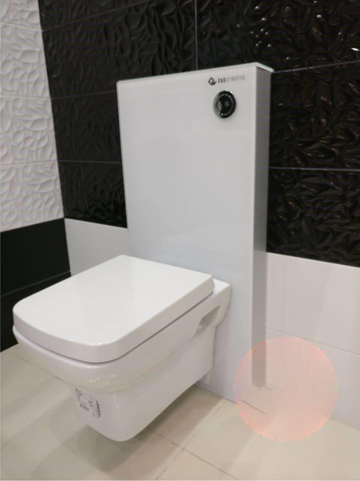1 Opbouw hangsysteem toiletset vervaardigd van gehard WIT veiligheidsglas bestaande uit opbouwreservoir , incl design hangtoilet met softclose toiletzitting. WVP 795€ Locatie: Magazijn.
