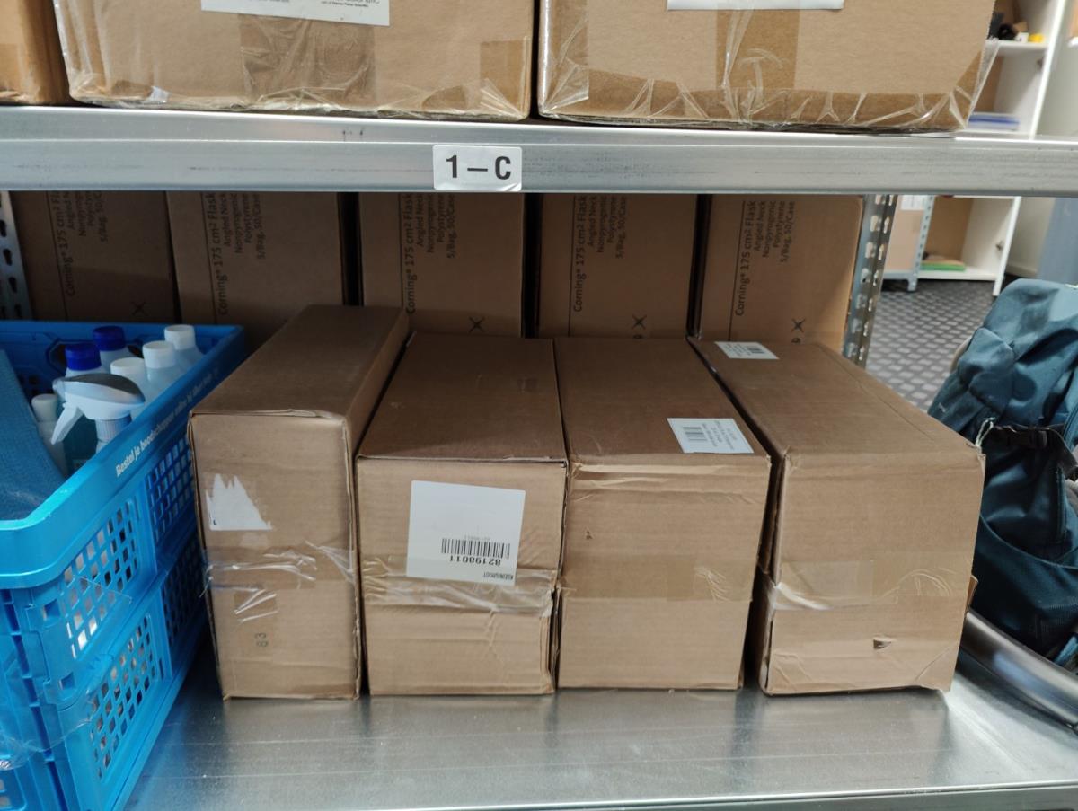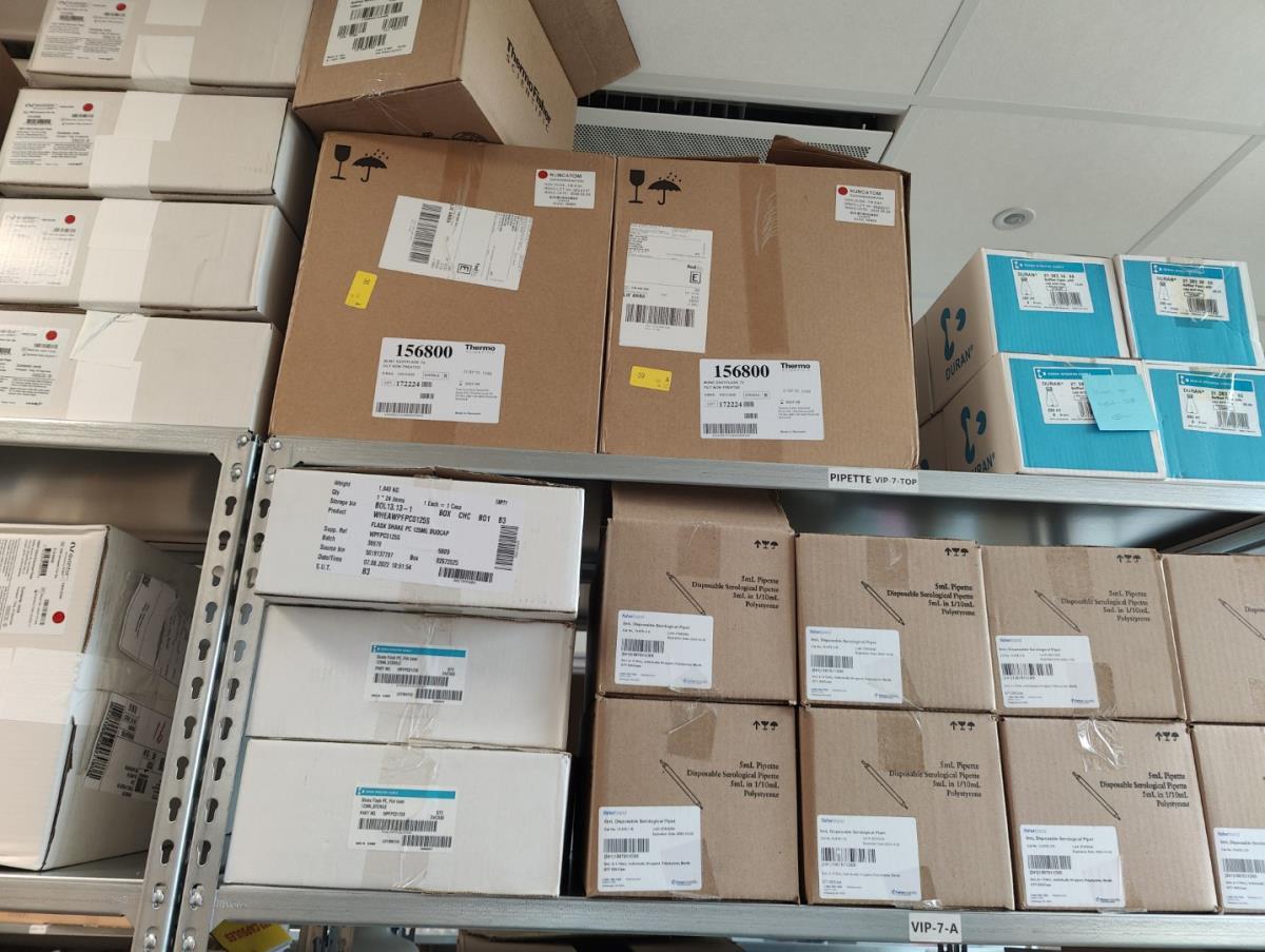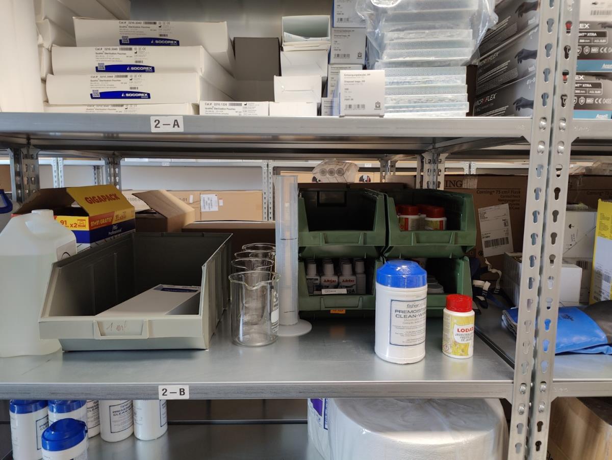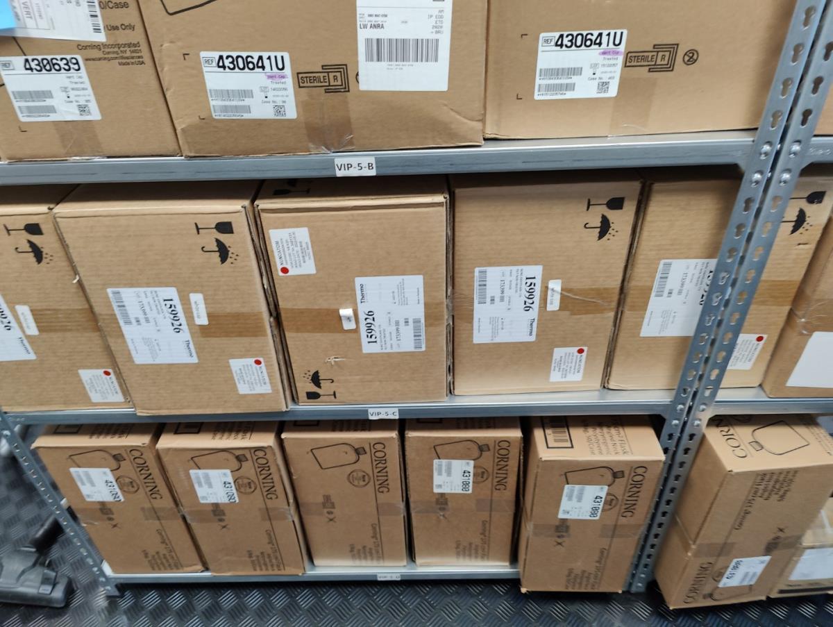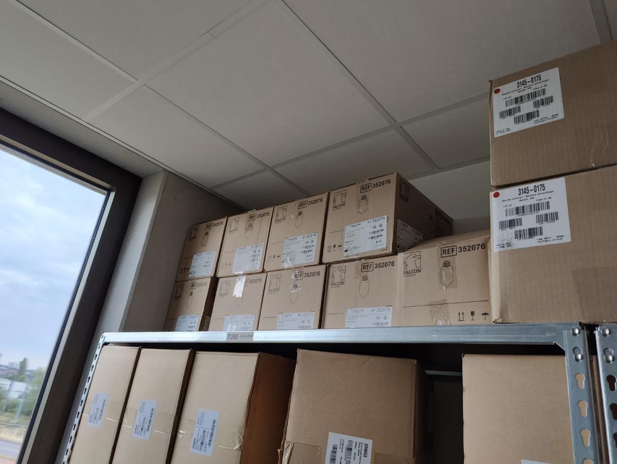 bu: div 2 Precisieweegschalen FISHERBRAND, Microcentrifuge tubes, ROTILABO Vriesboxen, CORNING cellstrainer, Tissue culture dish, FISHERBRAND plastic Syringe, Syringe filters, Cell culture plates, Tissue Culture plates, Pippet tips, Aerosol resistent tips, Universal Fit Pippet Tips, 2 meubelkarretjes MEISTER, Chemical spill kit, Sterilisation Pouches, Javel tabletten, schoonmaakmiddelen, PBM's, Lab coats, Stofzuiger BOSCH Serie 2, FIlter Caps, Cell Culture Multi flasks, Erlenmeyer flasks, Rapid flow filters, ea