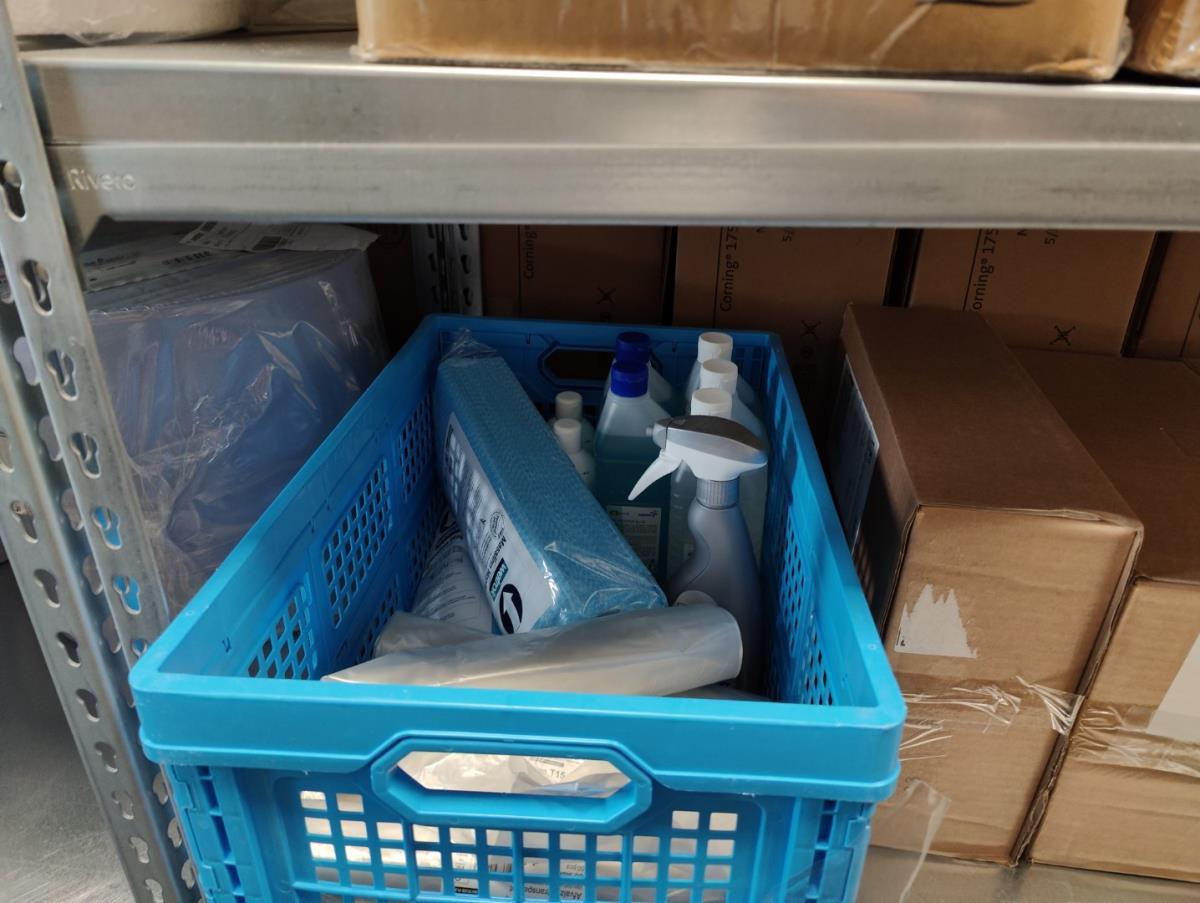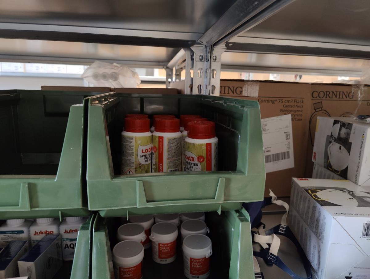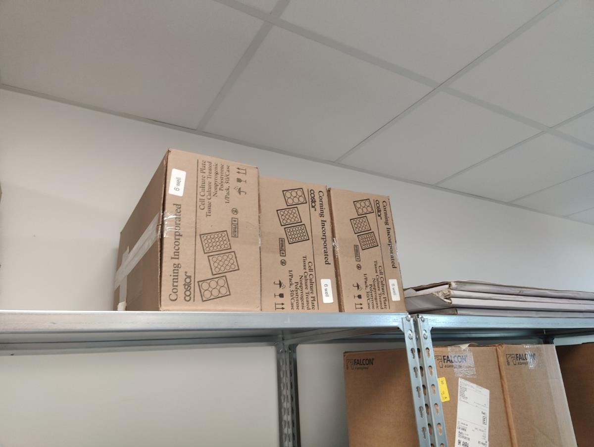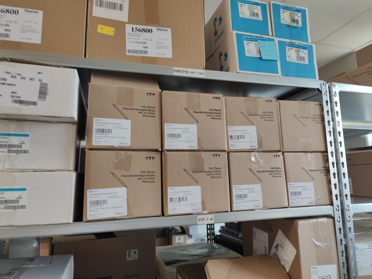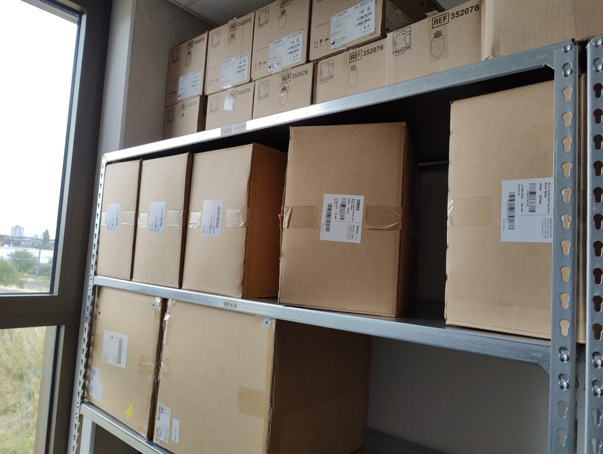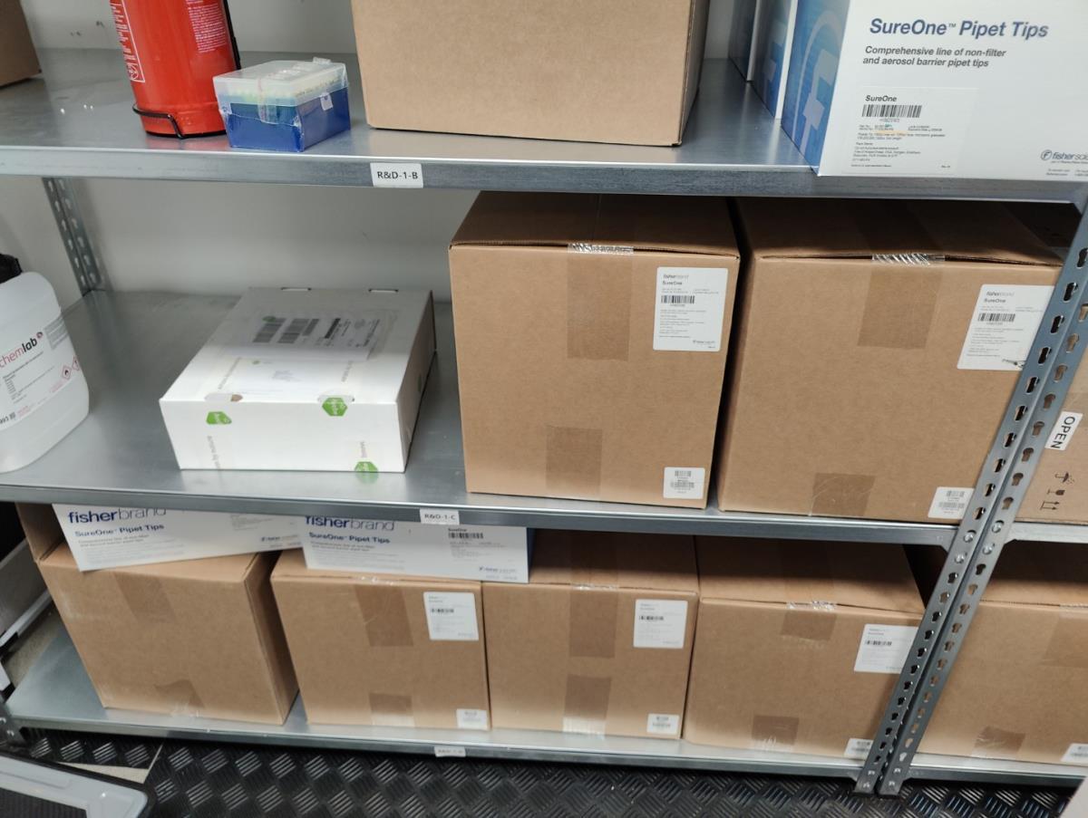 bu: div 2 Precisieweegschalen FISHERBRAND, Microcentrifuge tubes, ROTILABO Vriesboxen, CORNING cellstrainer, Tissue culture dish, FISHERBRAND plastic Syringe, Syringe filters, Cell culture plates, Tissue Culture plates, Pippet tips, Aerosol resistent tips, Universal Fit Pippet Tips, 2 meubelkarretjes MEISTER, Chemical spill kit, Sterilisation Pouches, Javel tabletten, schoonmaakmiddelen, PBM's, Lab coats, Stofzuiger BOSCH Serie 2, FIlter Caps, Cell Culture Multi flasks, Erlenmeyer flasks, Rapid flow filters, ea