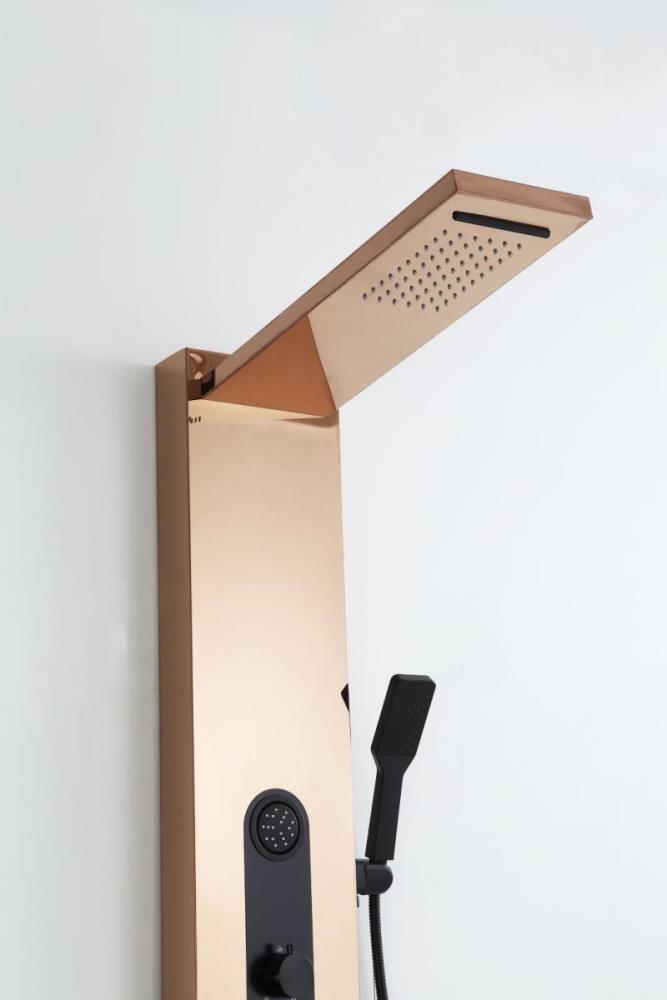 1x rvs douchepaneel, model: 5618 rose goud met zwarte details , functies: 1xbodyjets, 1xhoofddouche, 1xhanddouche, 1x voetwaterval, 1x hoofdwaterval, mengkraan, flexibele slang 150cm, afm. 150x22cm (hxb), dit betreft een nieuw product in doos.