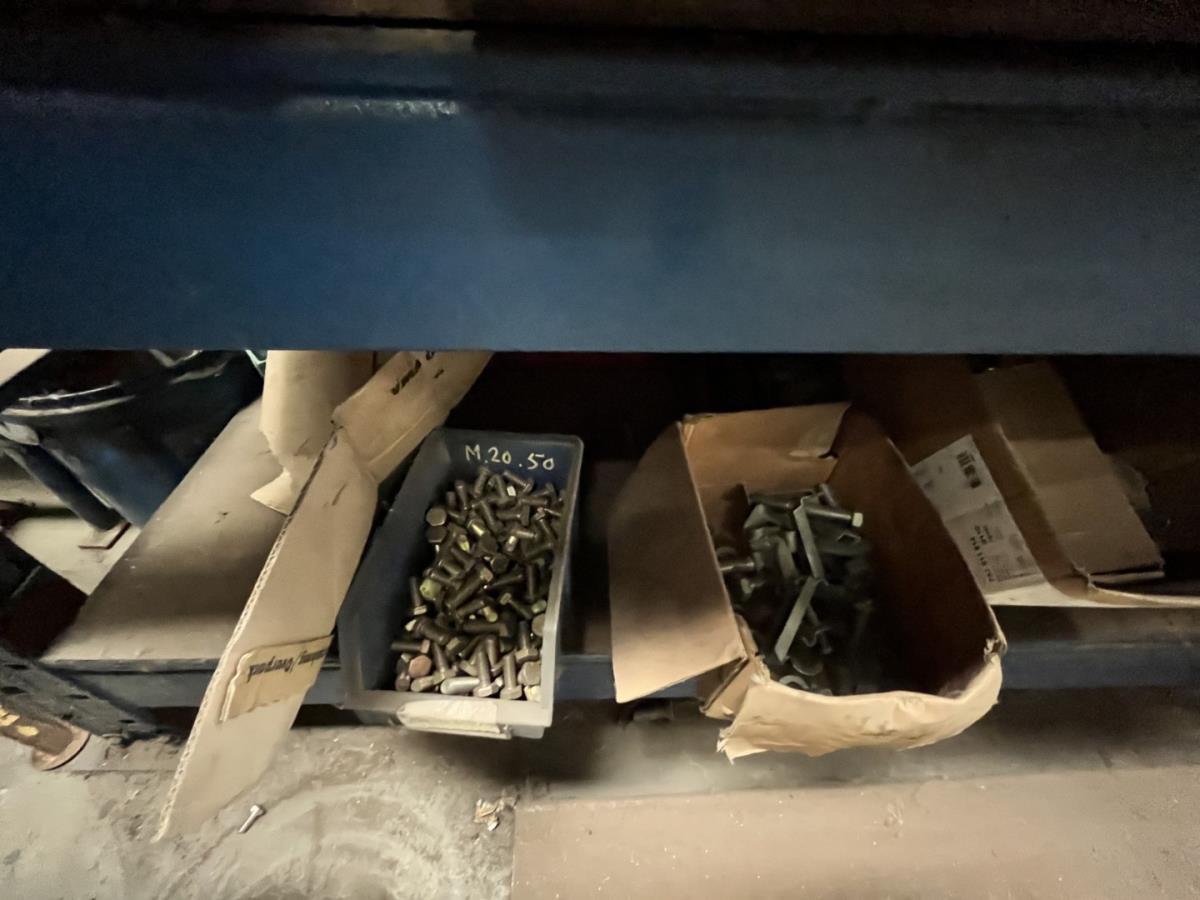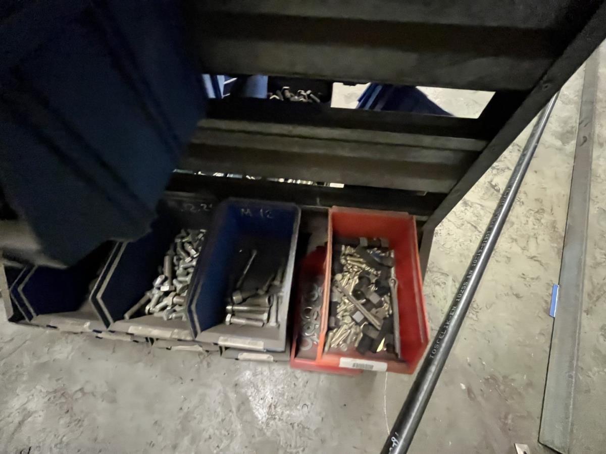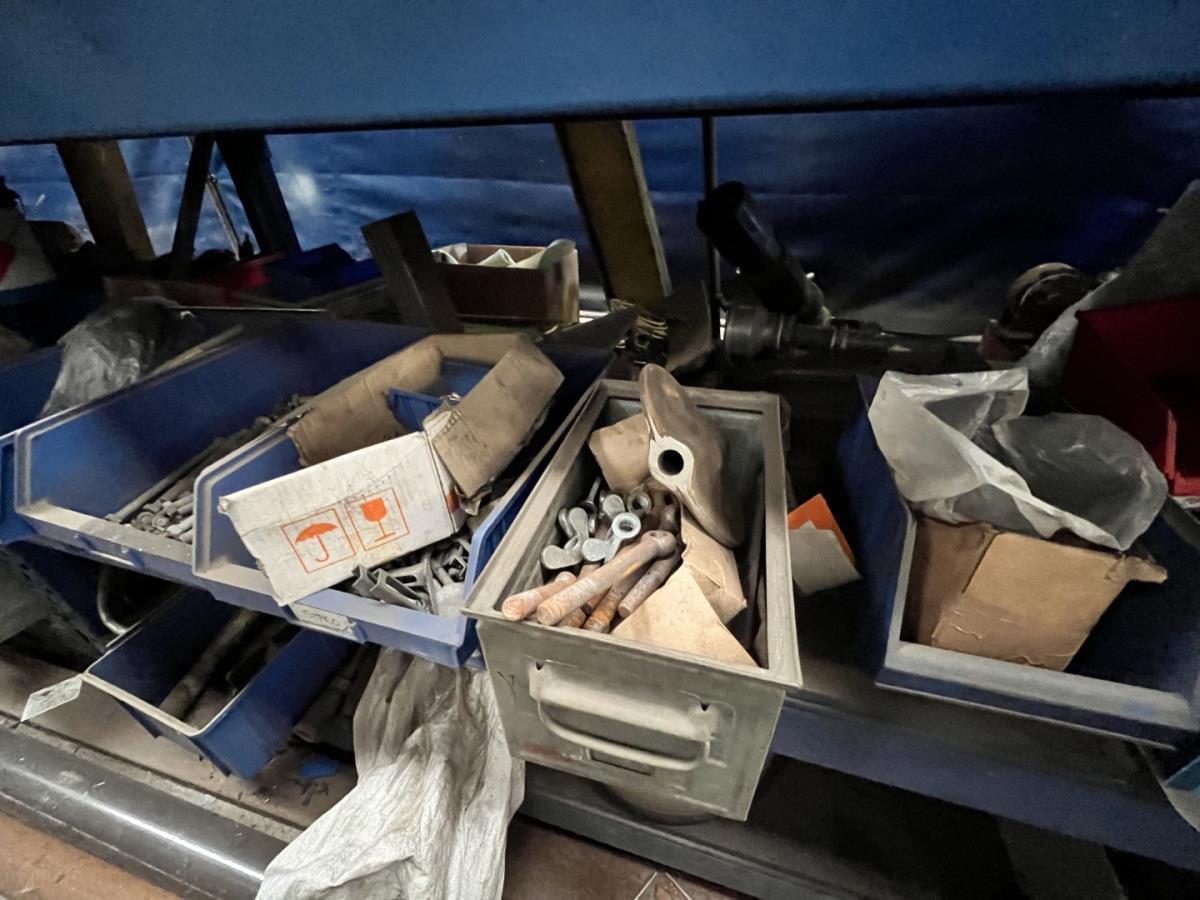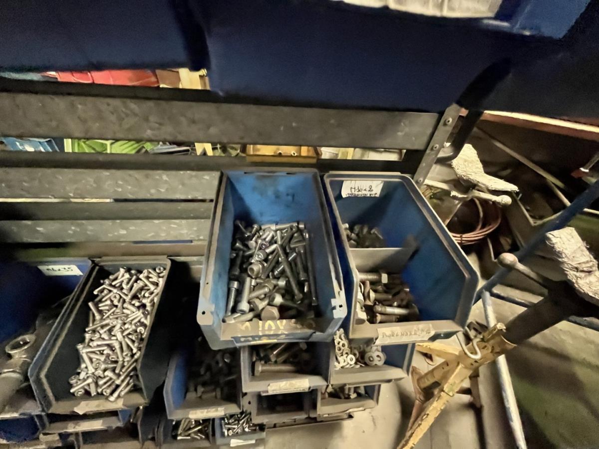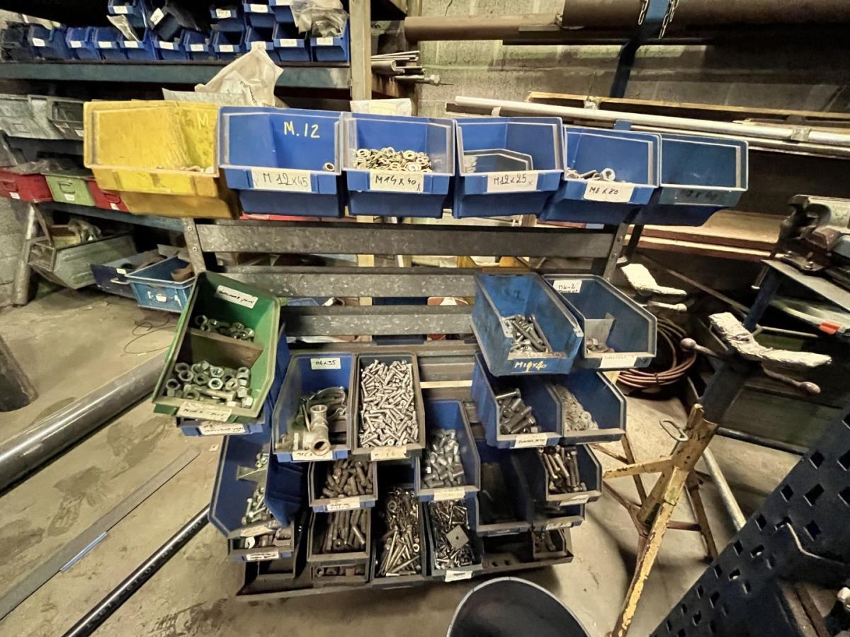 incl staal afval, bouten, moeren, koppelstukken, werktafel met bankvijs, verrijdbare kar inh plm 36 div pvc sorteerbakken incl bouten en moeren, ea