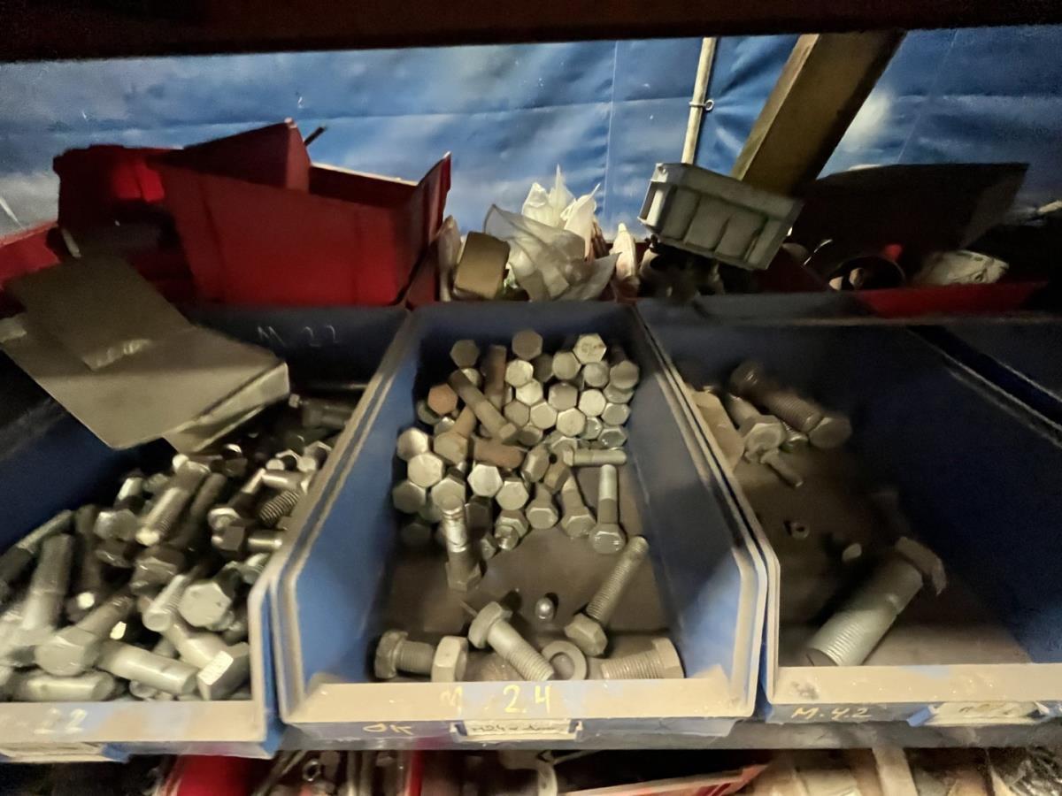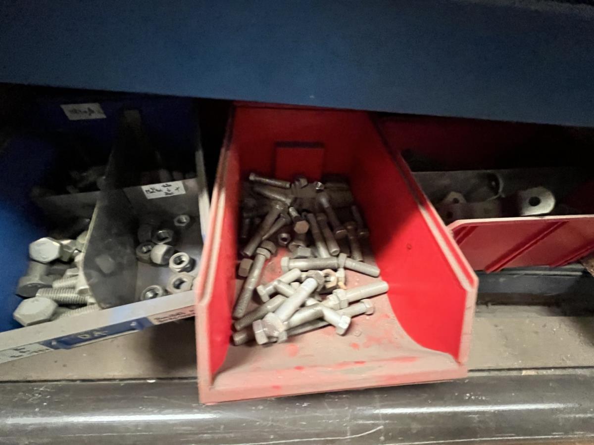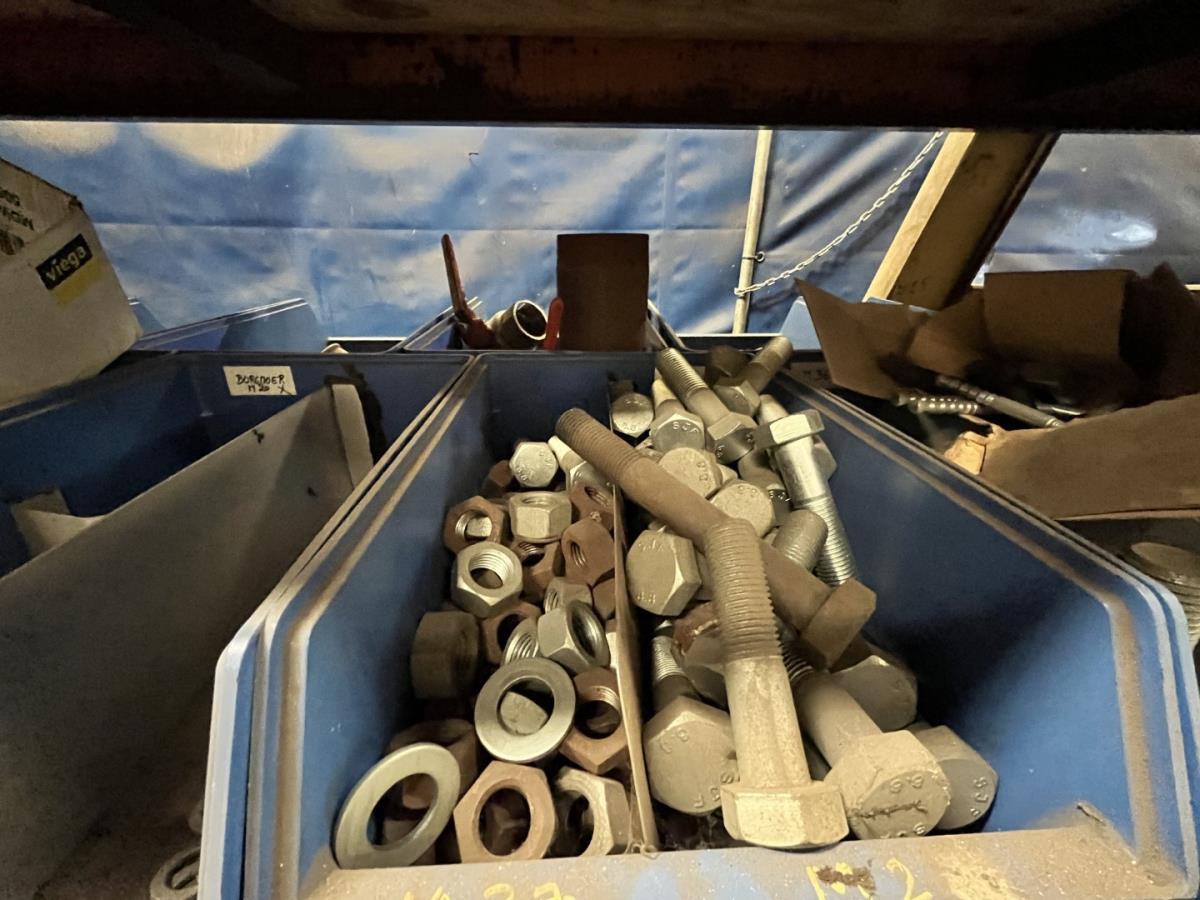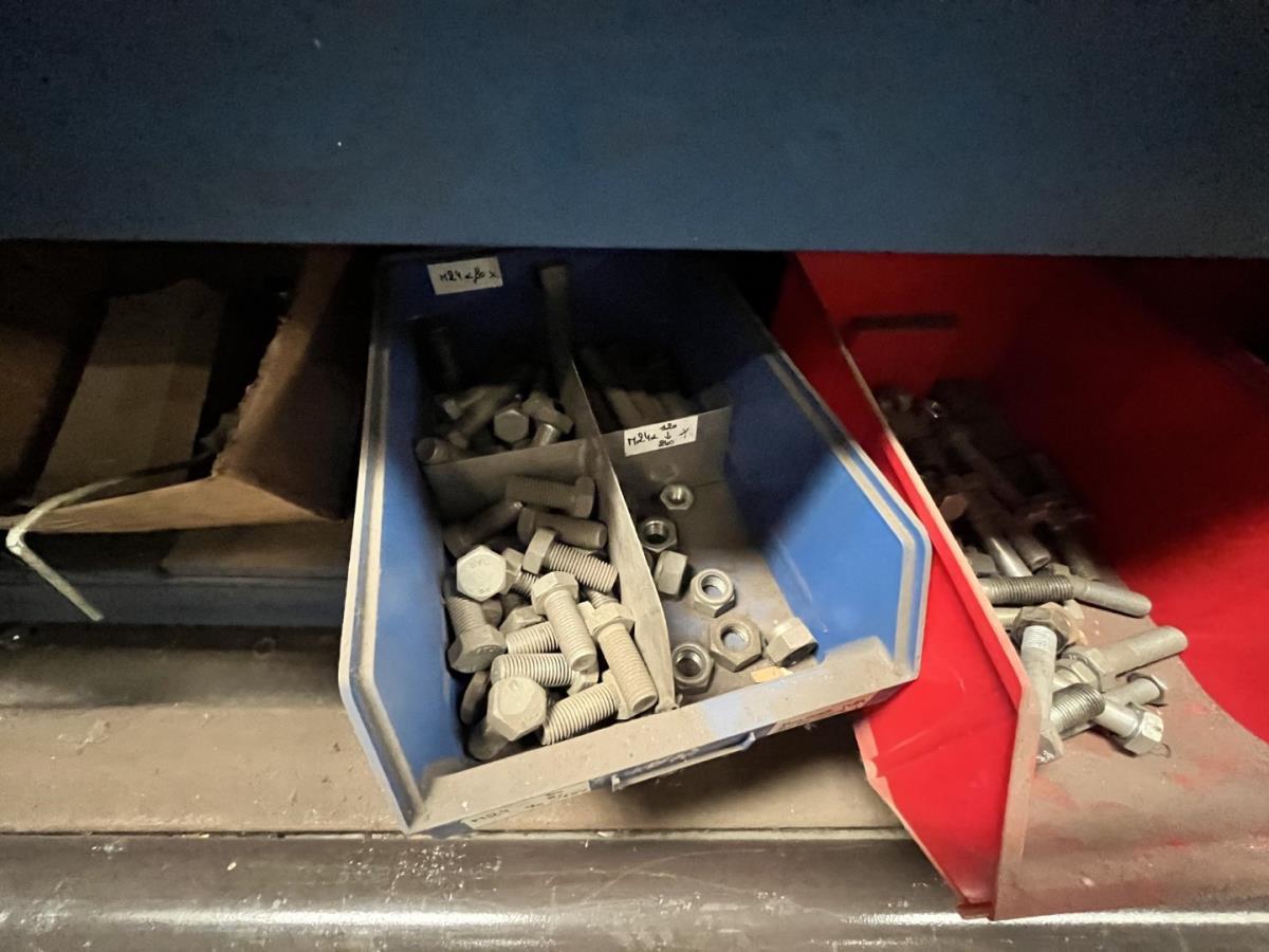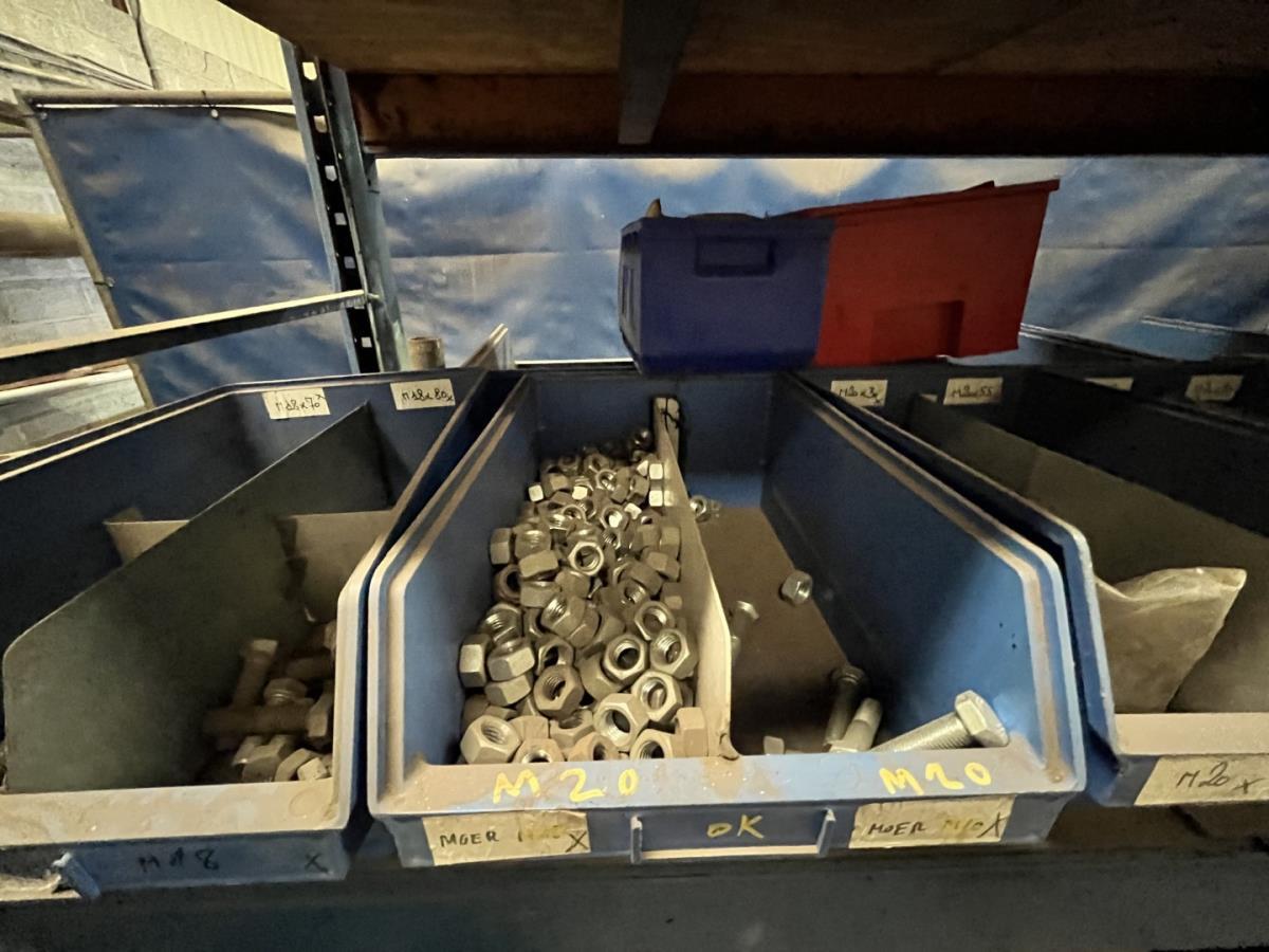 incl staal afval, bouten, moeren, koppelstukken, werktafel met bankvijs, verrijdbare kar inh plm 36 div pvc sorteerbakken incl bouten en moeren, ea