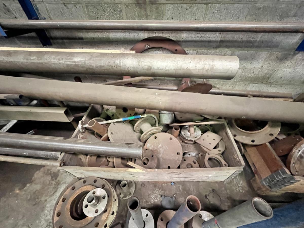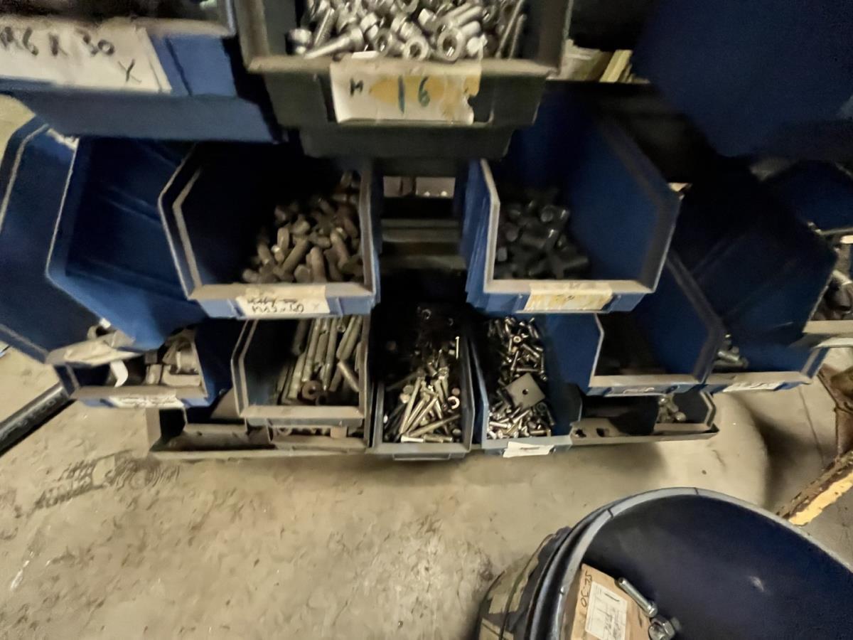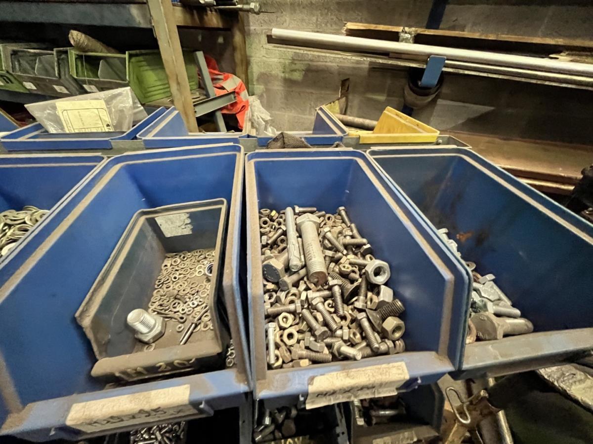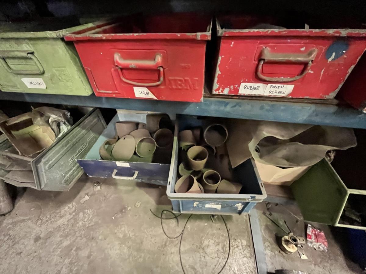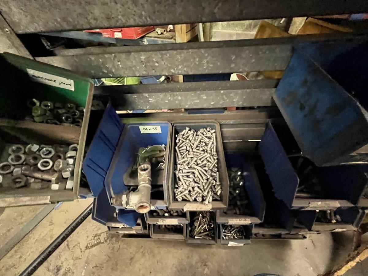 incl staal afval, bouten, moeren, koppelstukken, werktafel met bankvijs, verrijdbare kar inh plm 36 div pvc sorteerbakken incl bouten en moeren, ea