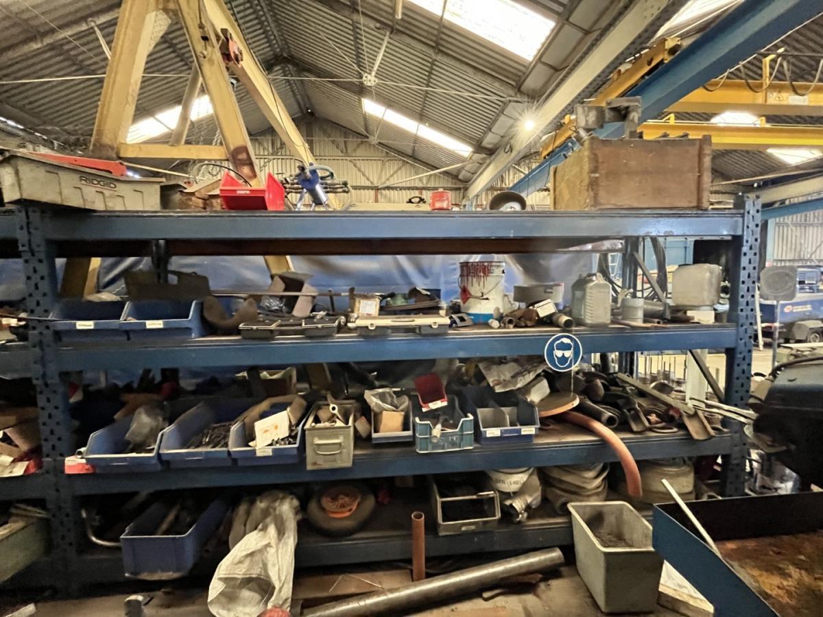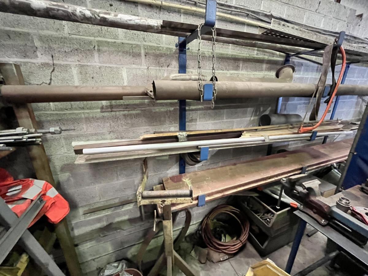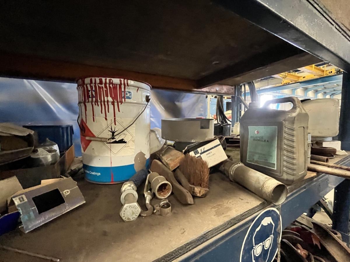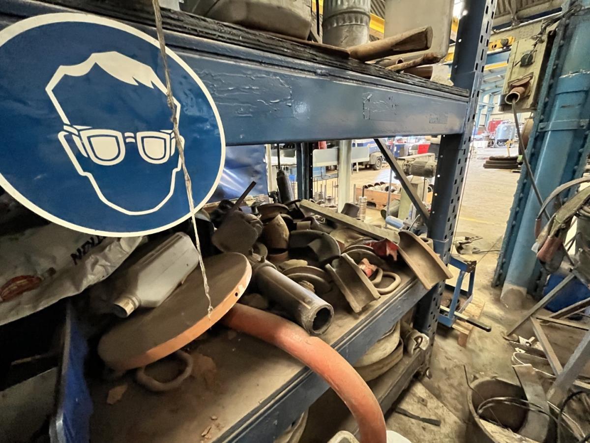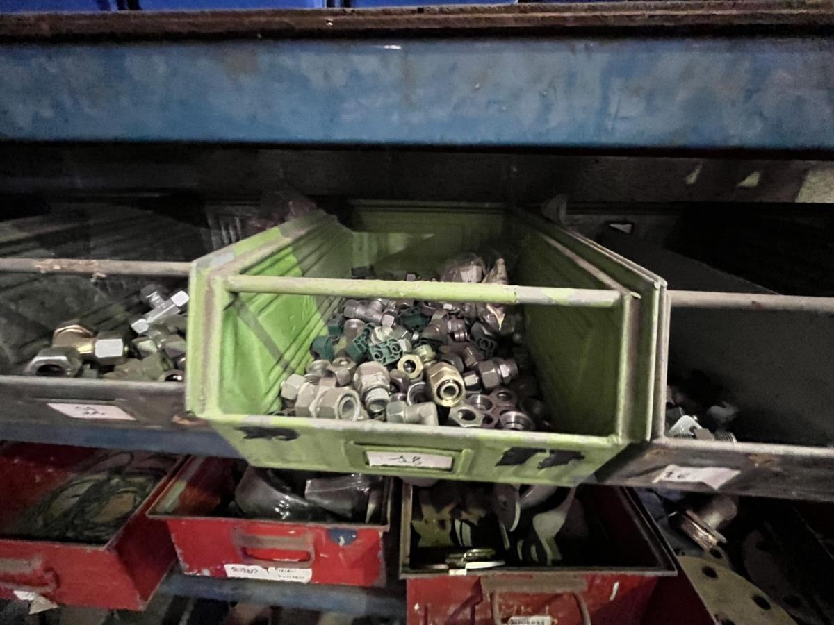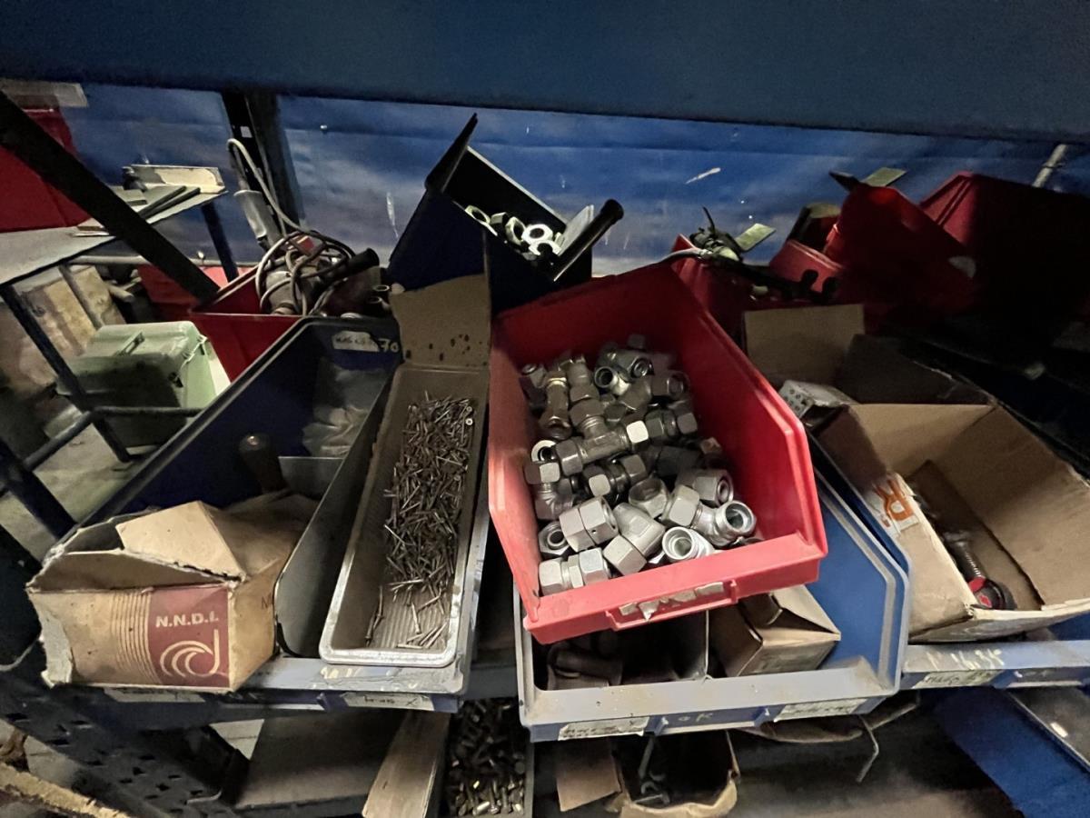 incl staal afval, bouten, moeren, koppelstukken, werktafel met bankvijs, verrijdbare kar inh plm 36 div pvc sorteerbakken incl bouten en moeren, ea