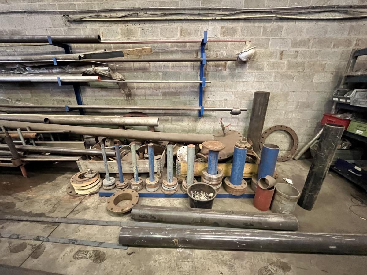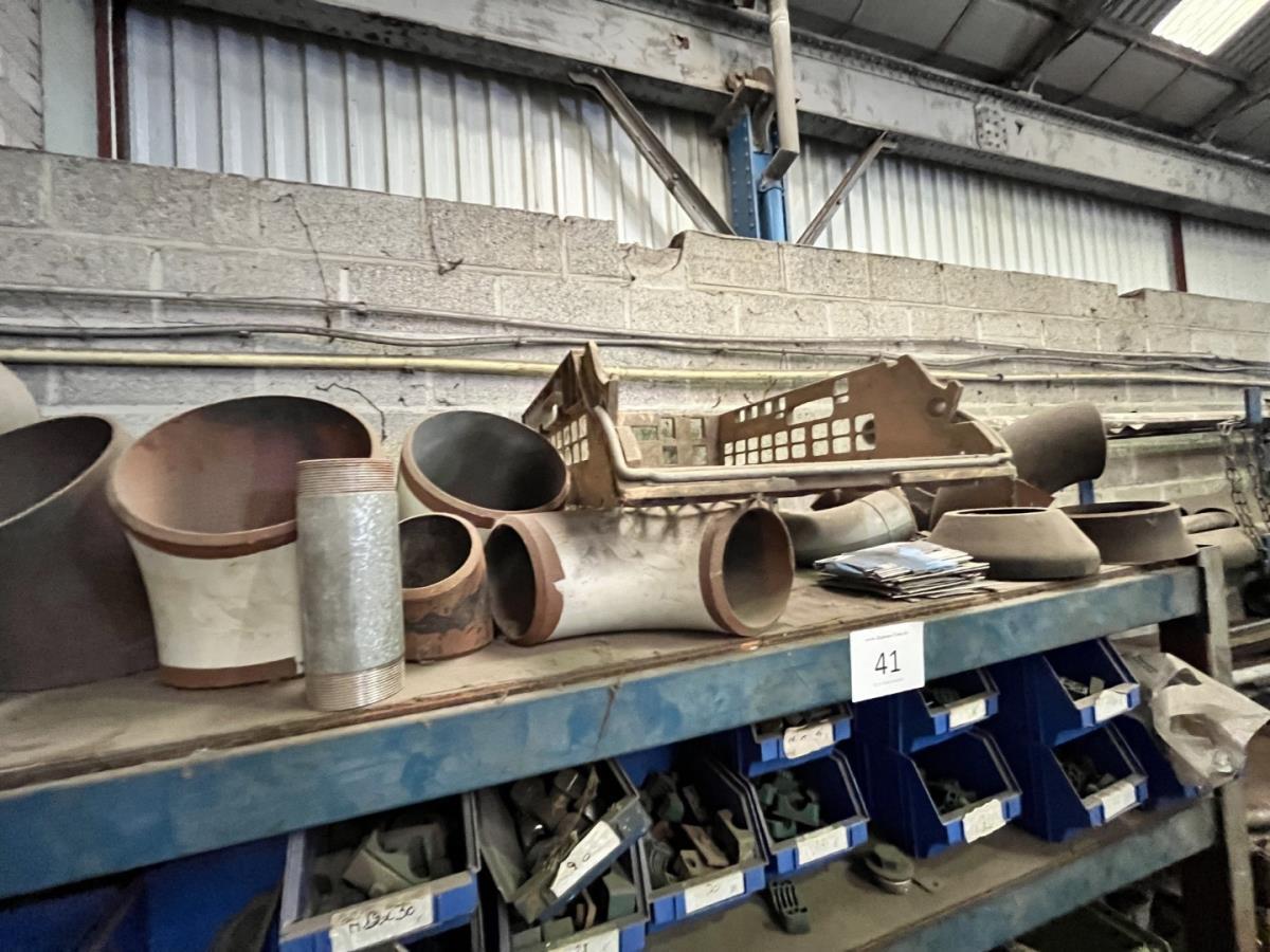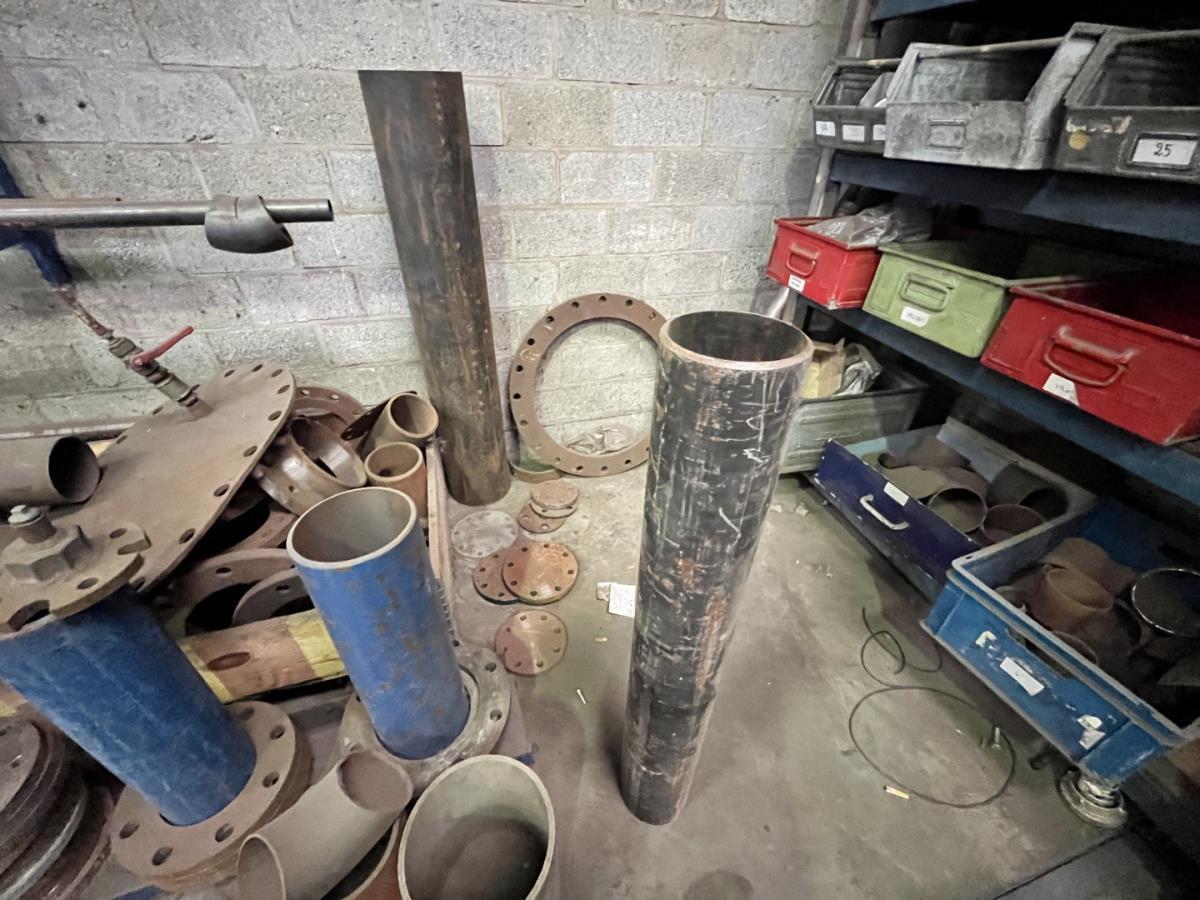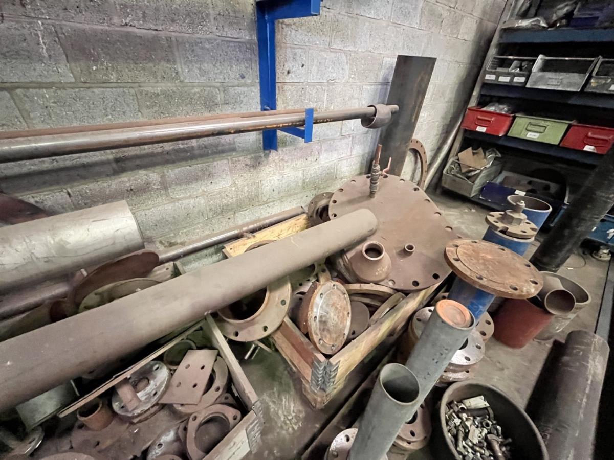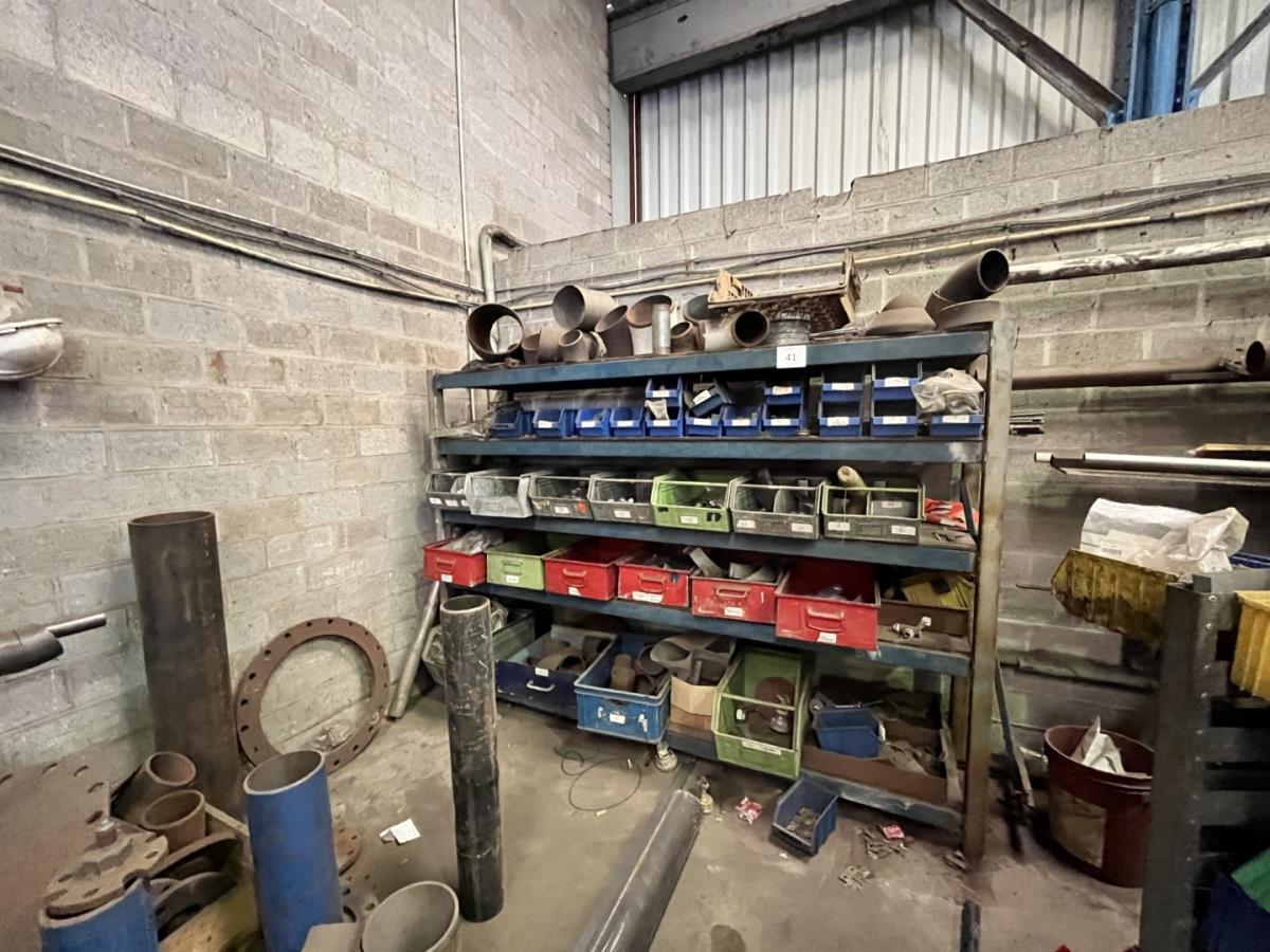 incl staal afval, bouten, moeren, koppelstukken, werktafel met bankvijs, verrijdbare kar inh plm 36 div pvc sorteerbakken incl bouten en moeren, ea