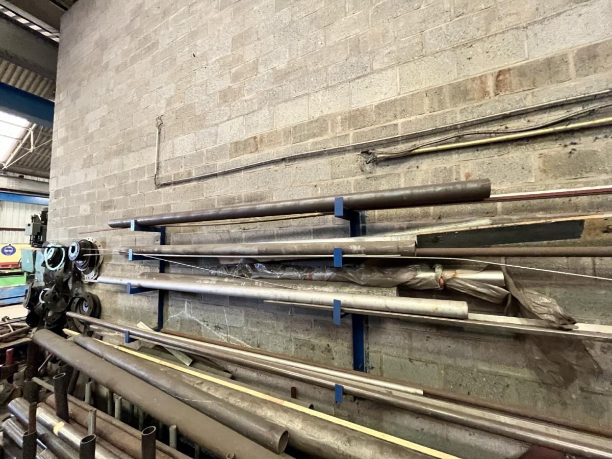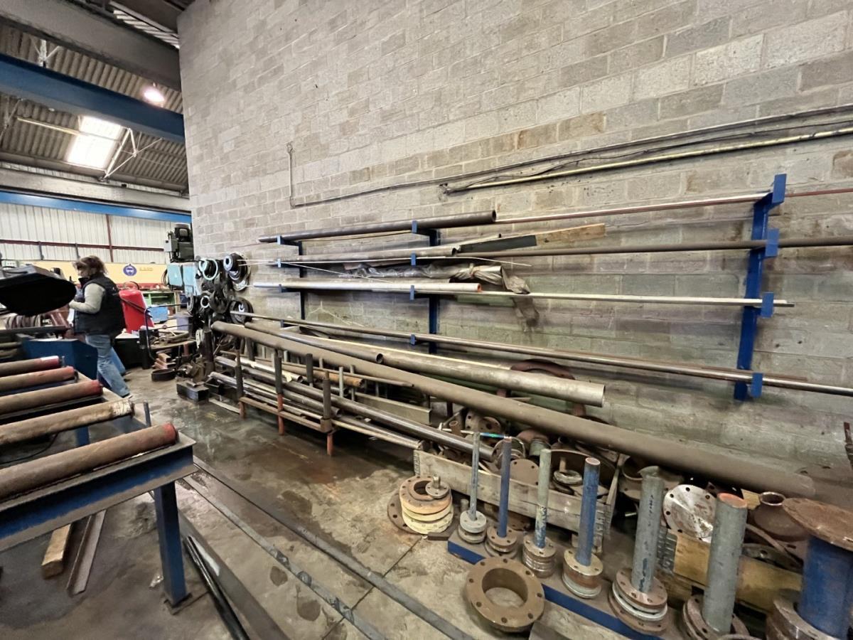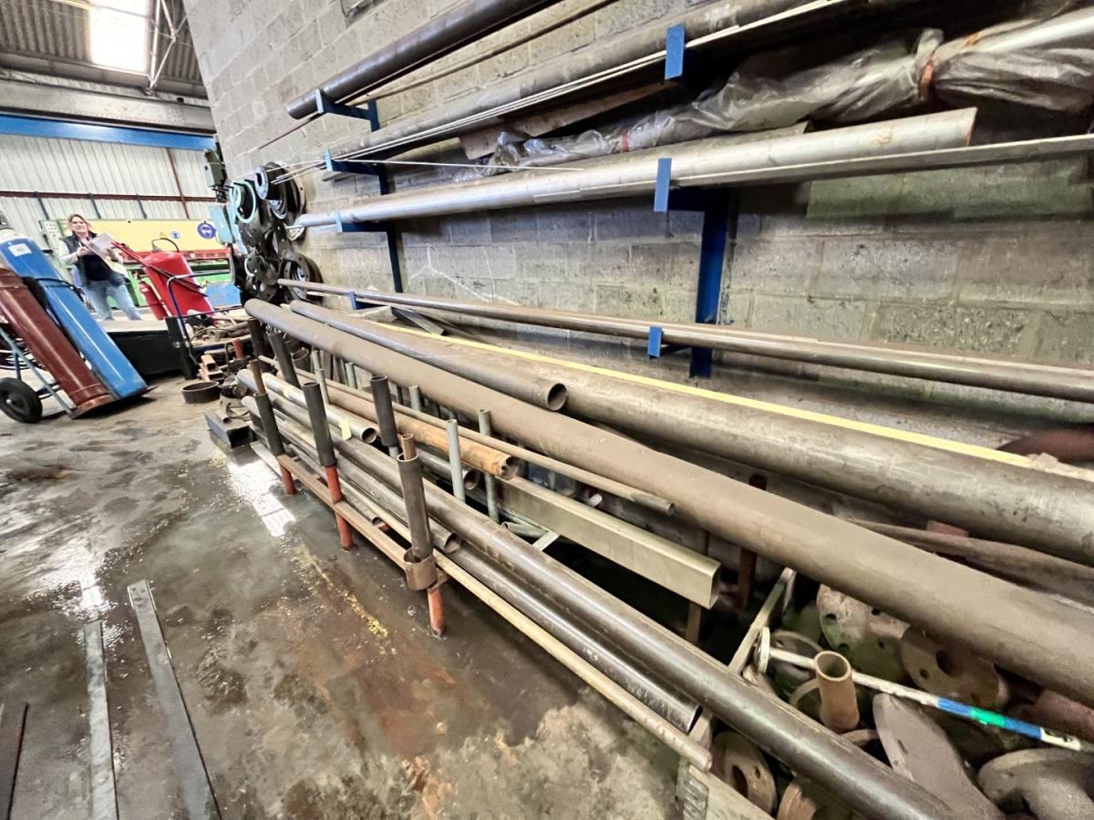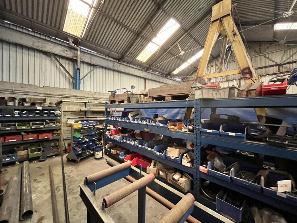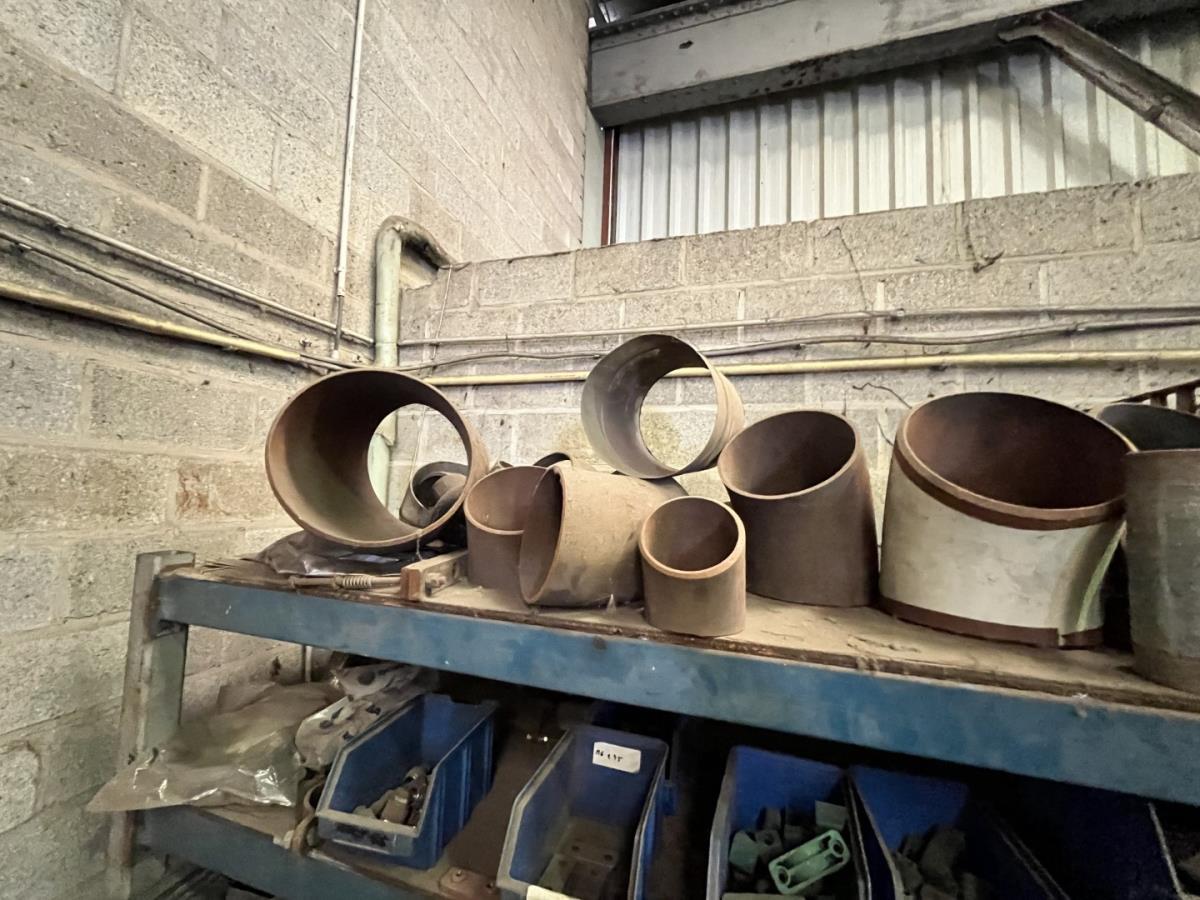 incl staal afval, bouten, moeren, koppelstukken, werktafel met bankvijs, verrijdbare kar inh plm 36 div pvc sorteerbakken incl bouten en moeren, ea