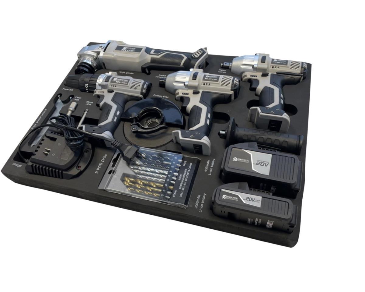 5 mchines en toebehoren op gereedschapstray; past in Gereedschapswagen; inhoud: 1 x slagmoersleutel 1/2” model R8001; 1 x boormachine model R7002; 1 x slagschroefmachine 1/4” model R7201-1; 1 x haakse slijper model AP18-03; met snellader; 2 x Lithium 20 Volt accu (2.000 en 4.000 mAh); 5 x doorslijpschijf; 1 x 1/4” 65 mm ADA; 1 x 1/2” 73 mm ADA; 1 x sleutel spankop haakse slijpmachine; met handleiding; ongebruikt en verpakt