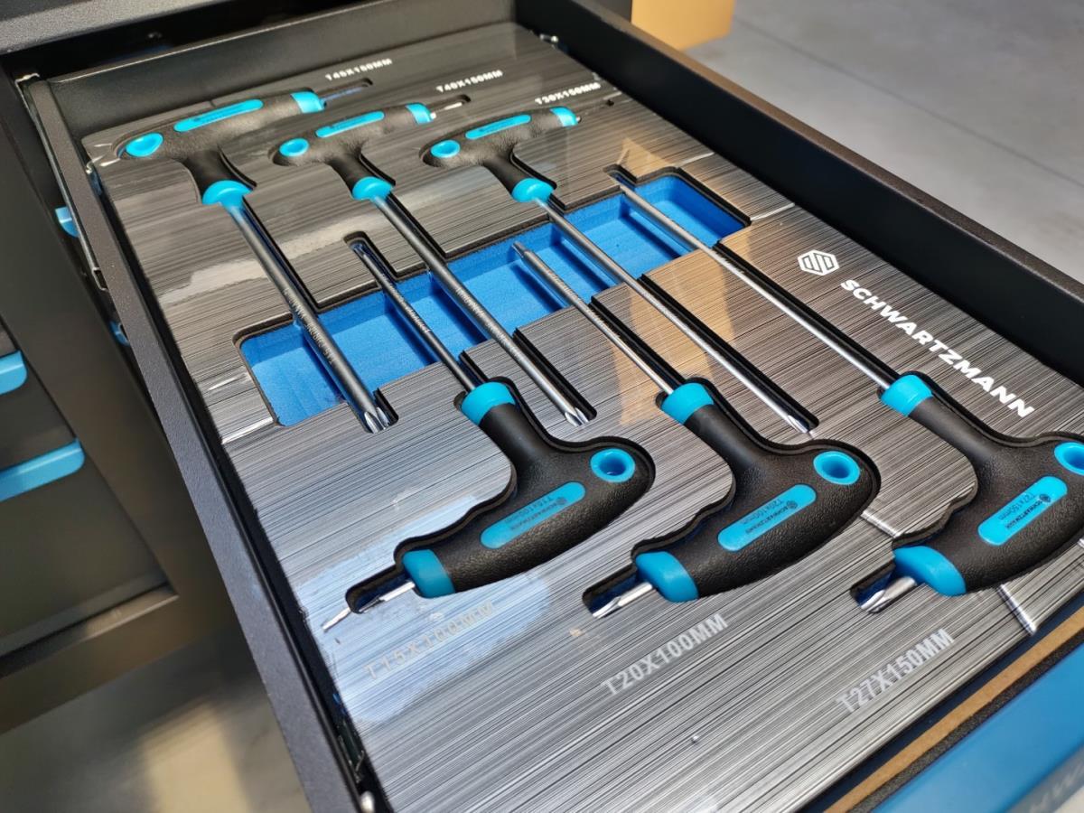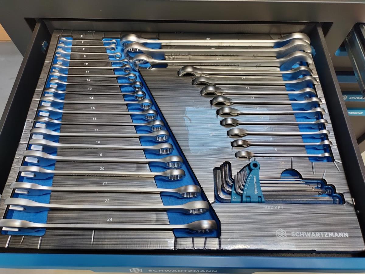 Unieke grote gereedschapswagen met 12 laden waarvan 10 laden gevuld met kwaliteits gereedschap, degelijke wagen met lades en wielen lopend op kogellagers, Houten bovenblad voor gebruik als werkbank, 1 meter breed,gewicht ca 120 kg, nieuw in doos