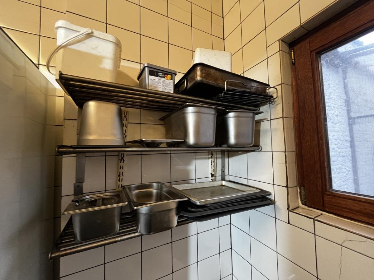 bu ijskast ( werking onbekend), ijzeren rek, potten, pannen, rvs opdienkar en alle rvs schabben bevestigd aan de muur. Koper staat zelf in voor demontage zonder schade te berokkenen aan het gebouw! Koper voorziet zich ook van eigen werkmateriaal.