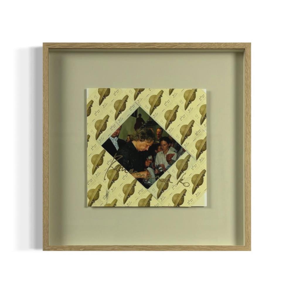 Gesigneerde originele collage van een foto en postzegels door Panamarenko - Uniek werk - Gesigneerd in goudstift door de kunstenaar - Professioneel ingelijst - Galerijprijs: 2750 37x37 cm