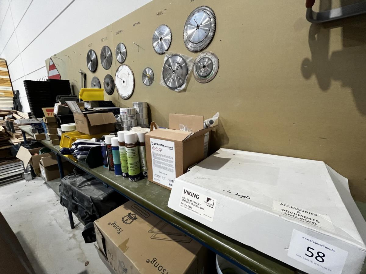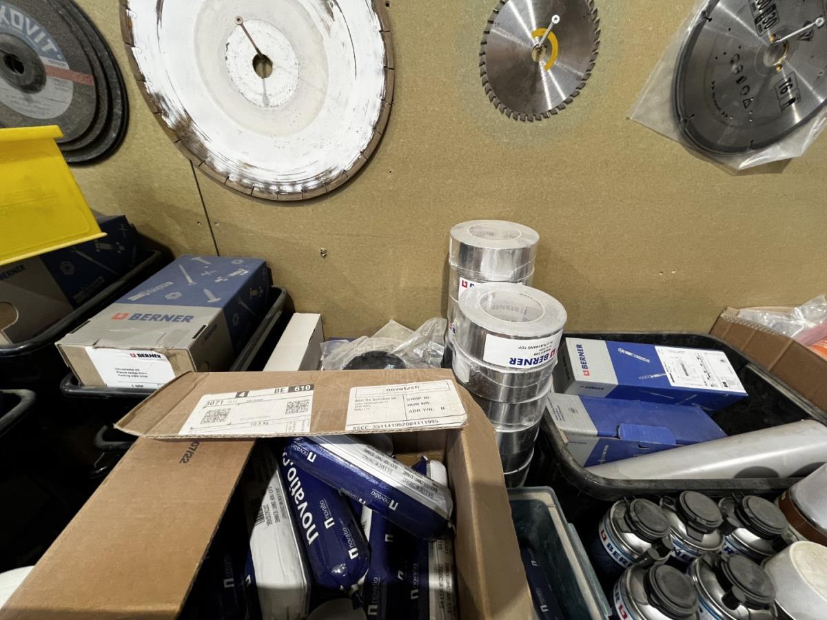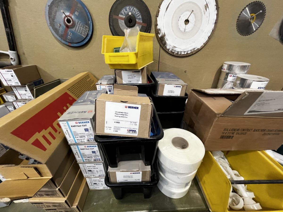 bu div onderhoudsproducten, reinigingsproducten, BERNER, NOVATIO, 2-Componentenlijm BERNER, Isolatietape BERNER, vasttapijttegels, uitvulplaatjes, div schietschroeven MAKITA, GYPROC TEKS schroeven, div zaagbladen en schuurschijven… ea