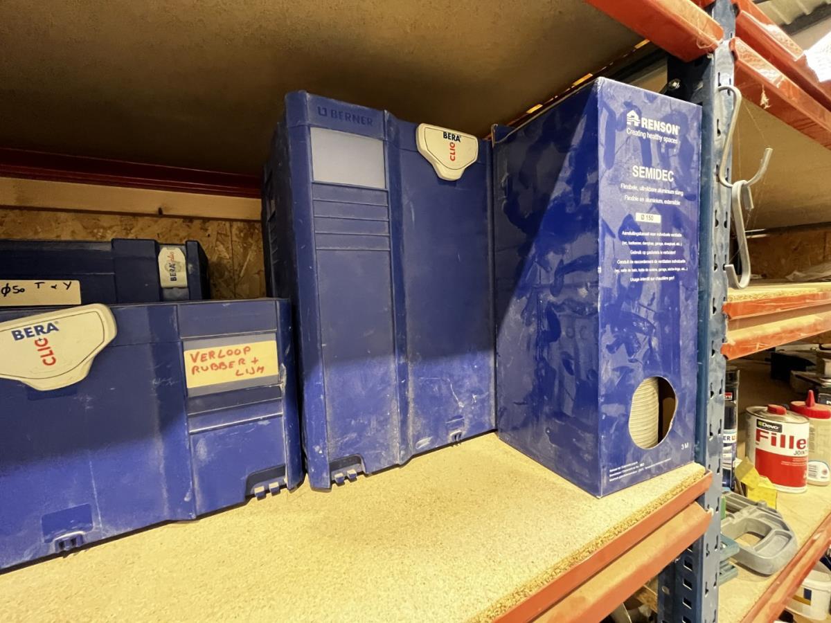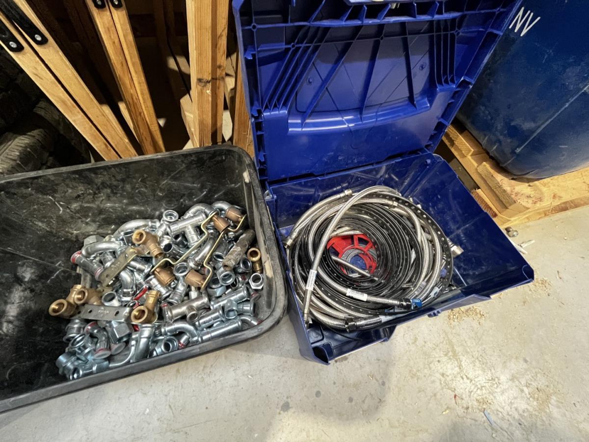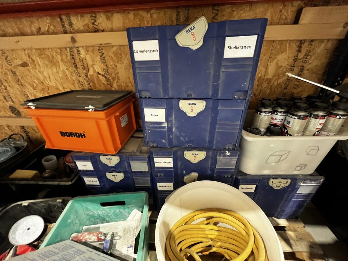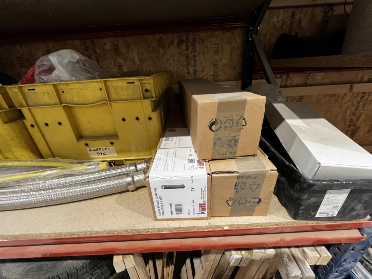 bu waterleidingslangen, PVC koppelstukken en ellebogen, koperen en messing koppelstukken, flexibels, houten schragen, terrasverhogers, div tegelgerief, afgifte volgens aanwijzing, koper dient alles mee te nemen.