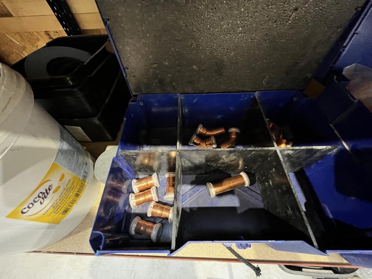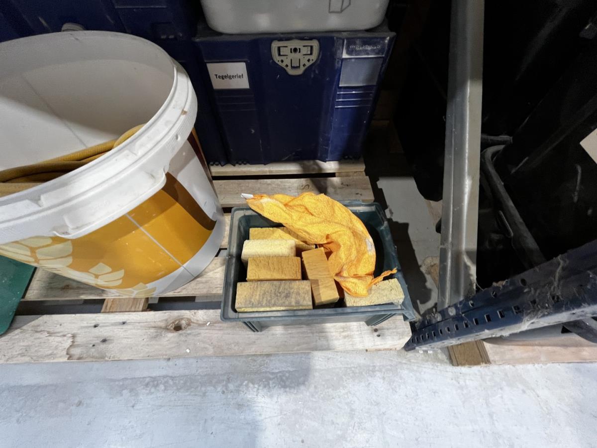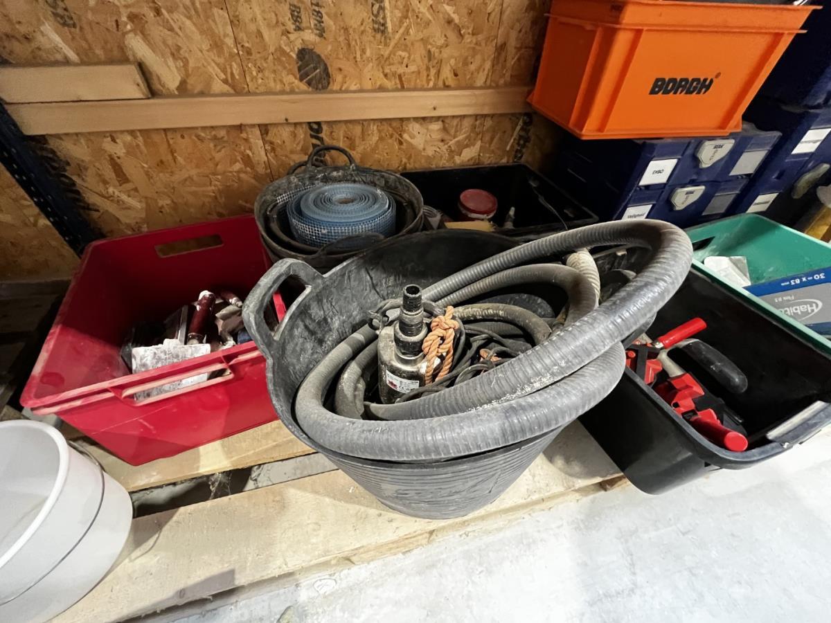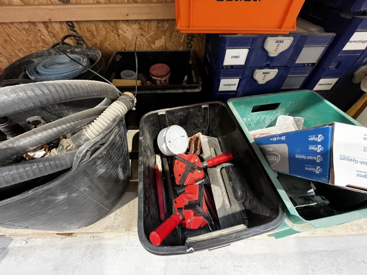 bu waterleidingslangen, PVC koppelstukken en ellebogen, koperen en messing koppelstukken, flexibels, houten schragen, terrasverhogers, div tegelgerief, afgifte volgens aanwijzing, koper dient alles mee te nemen.
