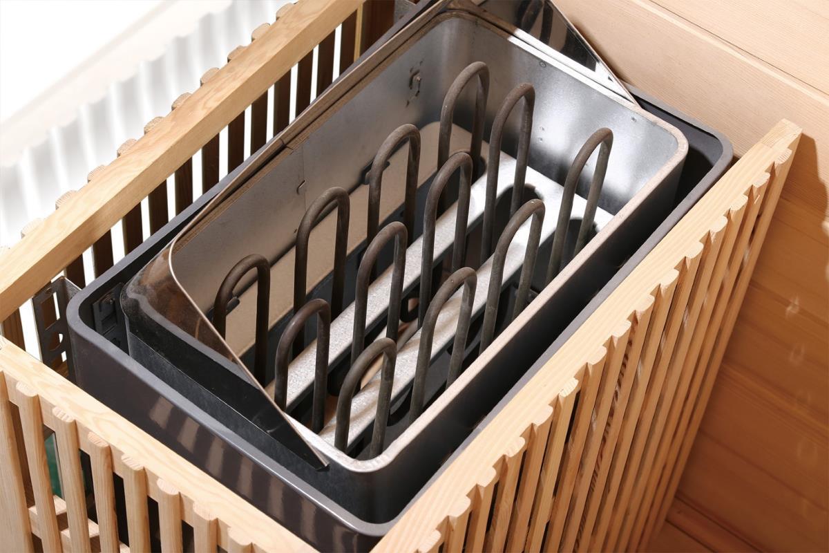 1x Luxueus ingerichte traditionele sauna; model: Lounge 04, houtsoort: Canada hemlock, ip54, met led sfeer verlichting, vol glas voorkant 8 mm veiligheidsglas, rvs heather en digitaal controller, thermometer en hygrometer, glazen timer, lava steen, geschikt voor 4-6 personen, uitsluitend samengesteld uit de beste materialen, afm: 200x200x210cm (lxbxh) ongebruikt
