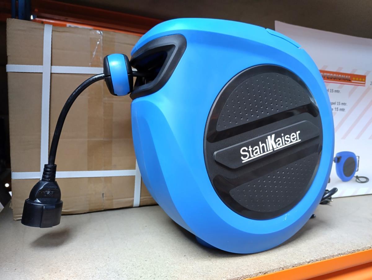 Stroomkabelhaspel met automatische afslag, 220 volt, 3x1,5mm, 1,5 meter aansluitkabel. Nieuw in doos