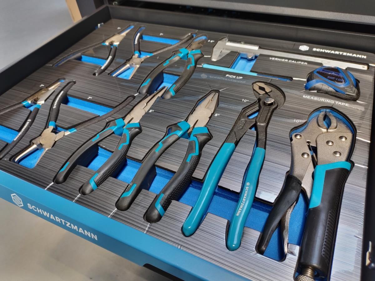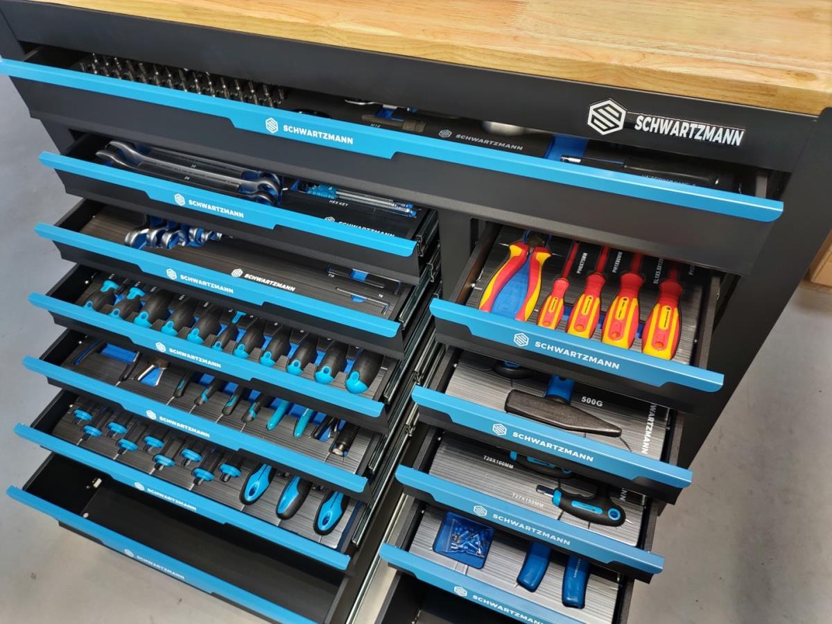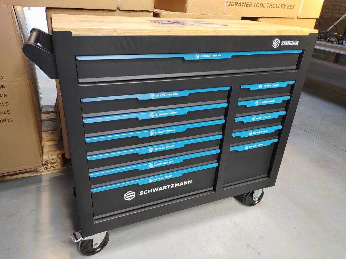 Unieke grote gereedschapswagen met 12 laden waarvan 10 laden gevuld met kwaliteits gereedschap, degelijke wagen met lades en wielen lopend op kogellagers, Houten bovenblad voor gebruik als werkbank, 1 meter breed,gewicht ca 120 kg, nieuw in doos
