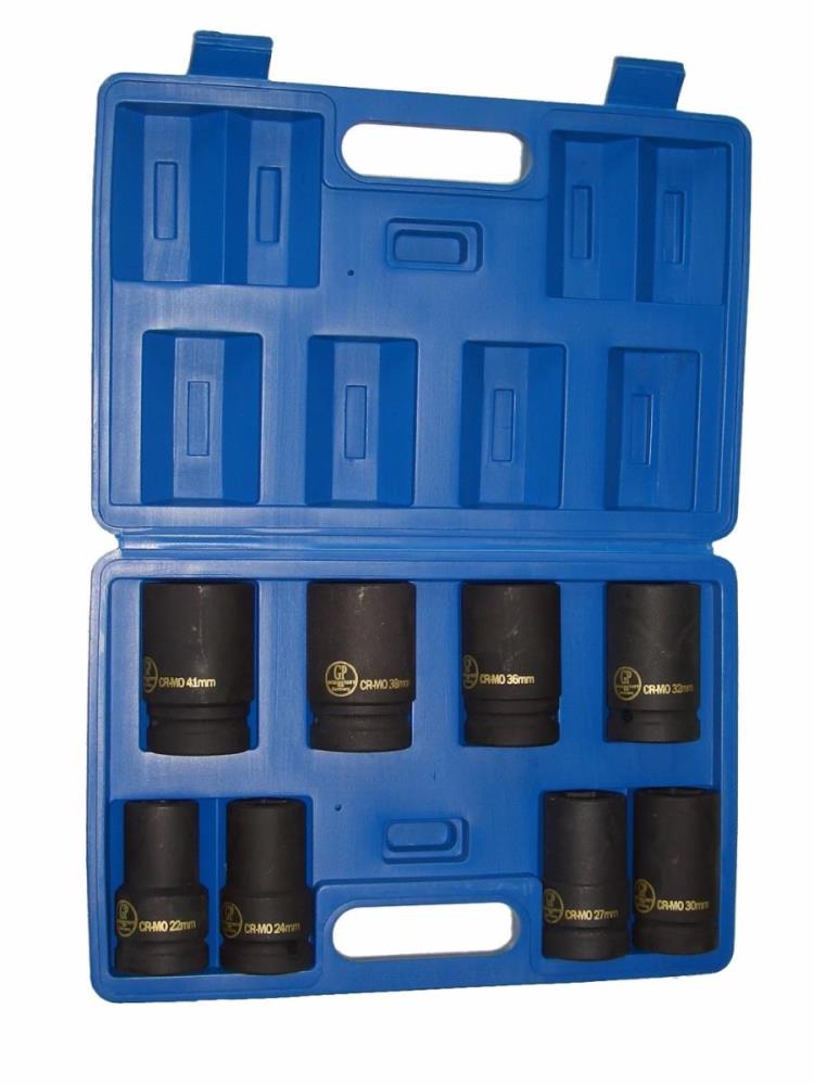 Doppenset, kracht 1″, 8-dlg. CR-M0, 24-41x 88 mm, Phosphated zwartOmschrijving: Doppenset, kracht 1″, 8 dlg. Maten 27-30-32-36-38-41-46-50 mm, voorzien van boring en kogel. Krachtdoppen geschikt voor zwaar werk met luchtcompressor. Materiaal: Chroom-Molybdeen, gefosforiseert. Krachtige ( Impact ) doppenset.