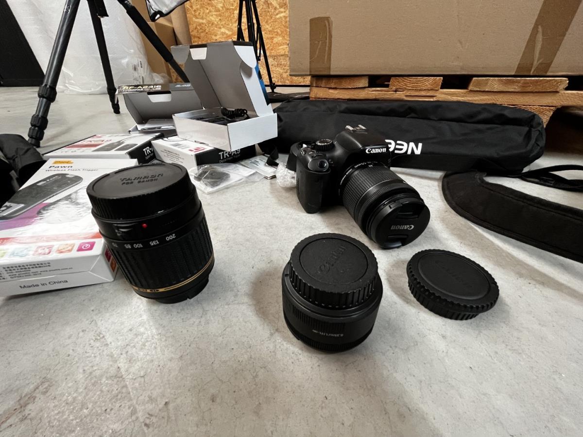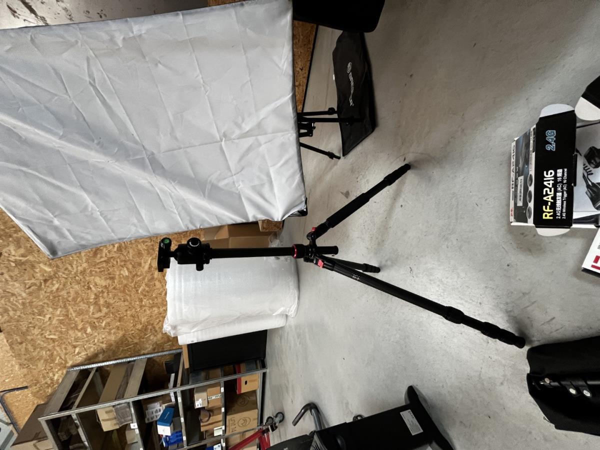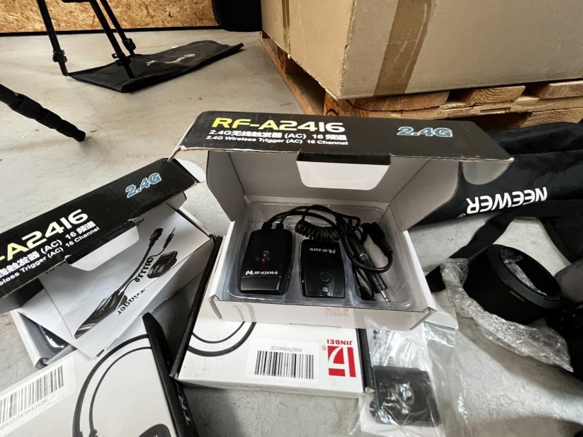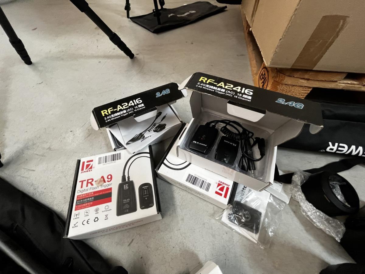 bu 2 spots BRESSER CD-400 met statieven + 3 losse statieven, div lenzen, flashtriggers, ea, allen in houten kist