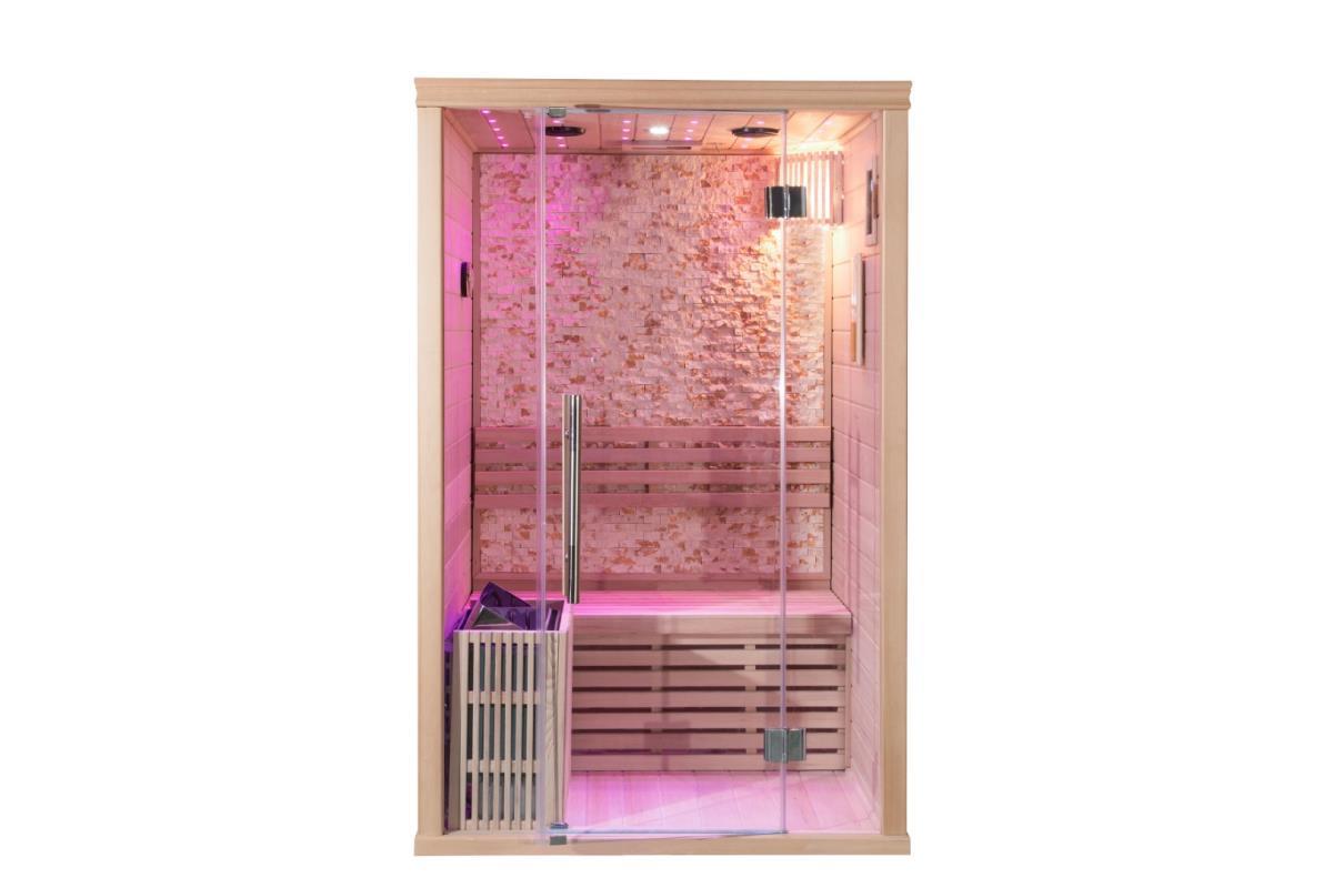 Comfort, 02, houtsoort: Canada hemlock, met led sfeer verlichting, vol glas voorkant 8 mm veiligheidsglas, rvs heather en digitaal controller, thermometer en hygrometer, glazen timer, lava steen, geschikt voor 1-2 personen, Uitsluitend samgensteld uit de beste materialen, afm: 120x105x190cm (l x b x h). Ongebruikt