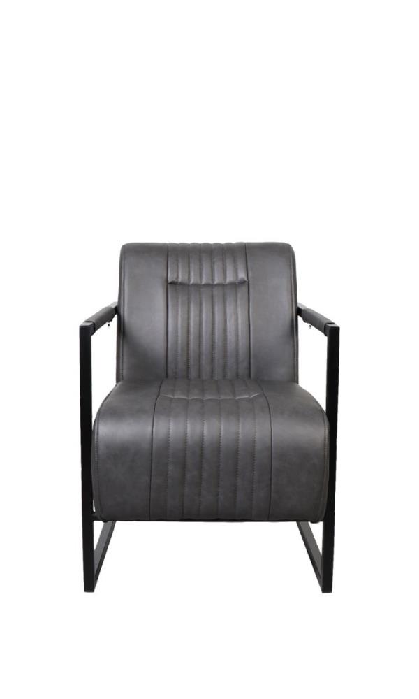 Design zetel, model: fero, kleur: dark grey, PU leather, verzwaard en gecoat stalen onderstel, slee poot, armleuningen gestoffeerd, conditie: niet gebruik