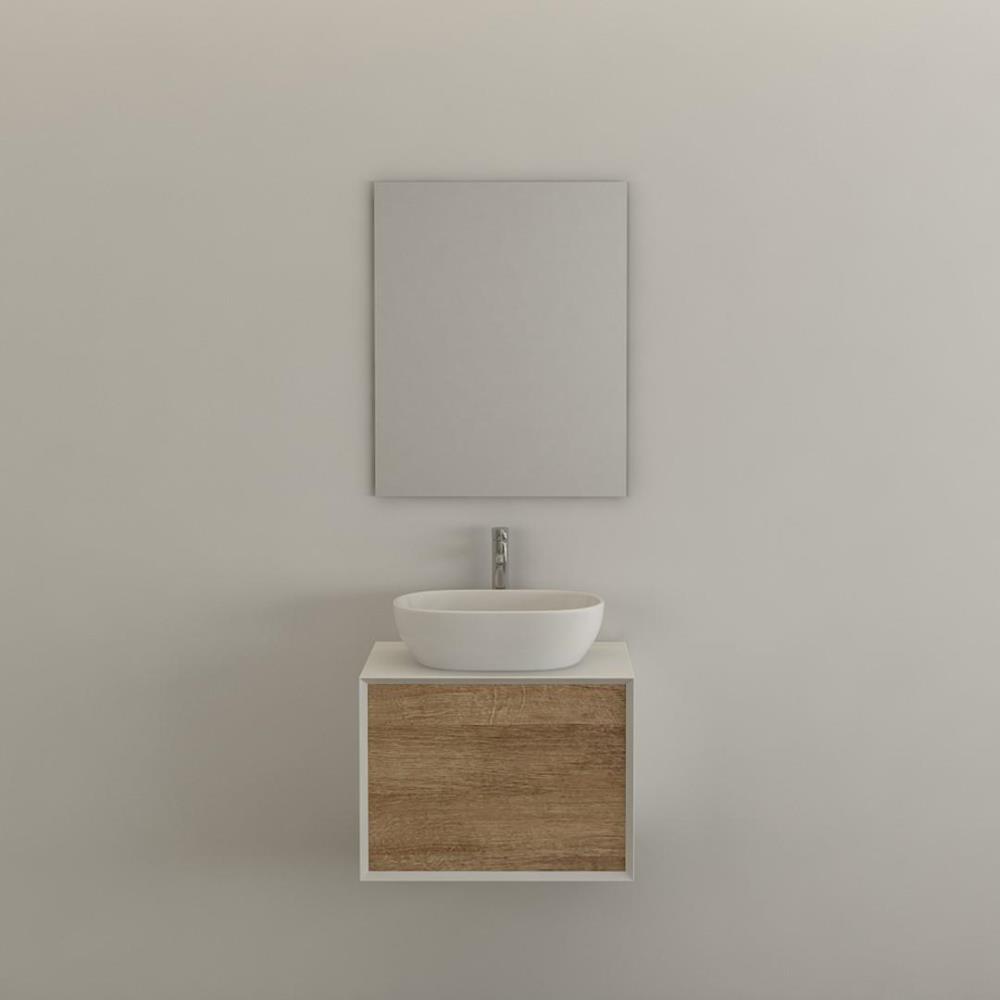 1x Badkamer meubilair, kleur wit/hout look, materiaal: frame wit hoogglans mdf hout look front, push to open lade; inclusief in set: 1x wasbak, 1x spiegel, 1x Push to open onderkast, afmeting: 60Lx 45Hx 50B exclusief kraan en afvoer.
