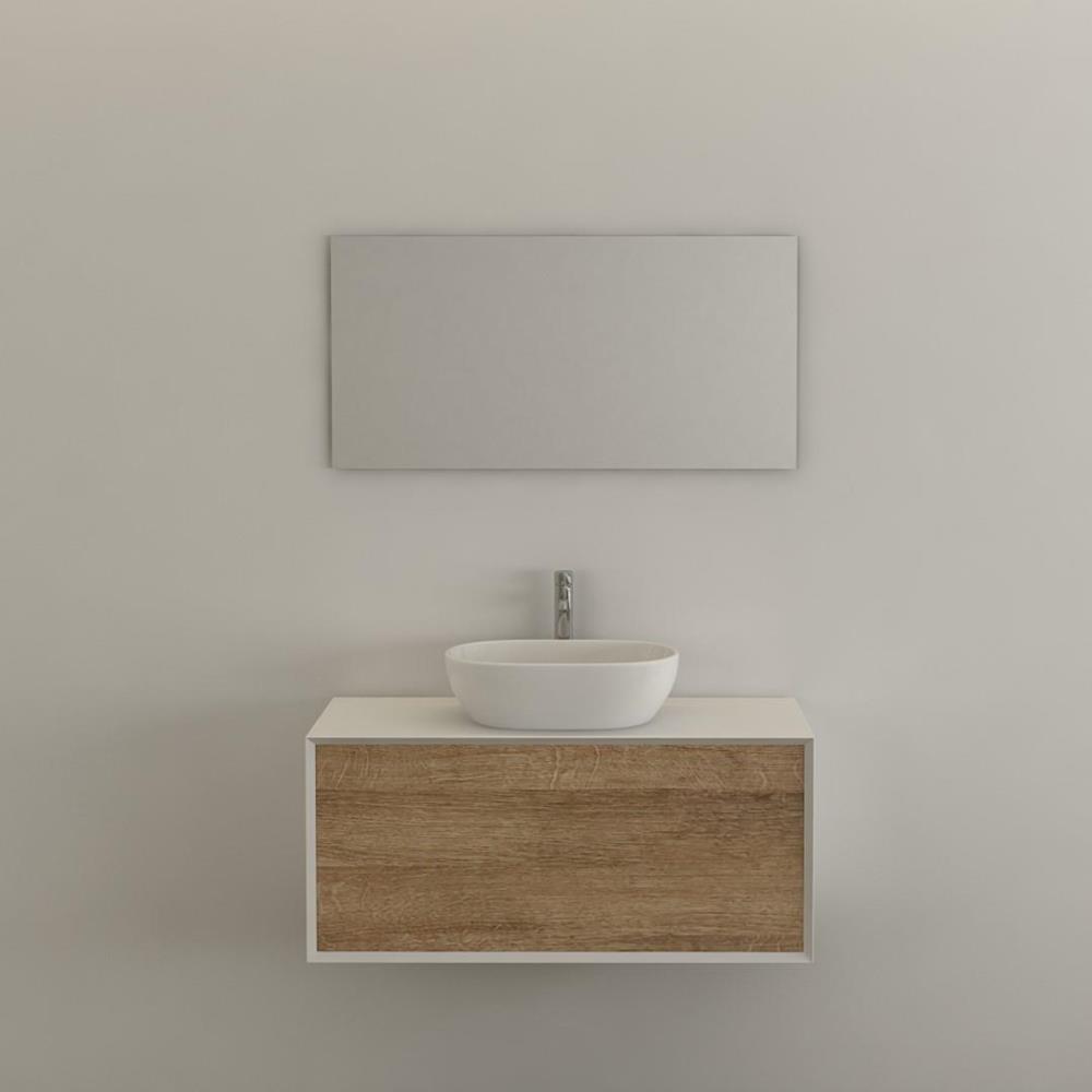 1x Badkamer meubilair, kleur wit/hout look, materiaal: frame wit hoogglans mdf hout look front, push to open lade; inclusief in set: 1x wasbak, 1x spiegel, 1x Push to open onderkast, afmeting: 100Lx 45Hx 50B exclusief kraan en afvoer.