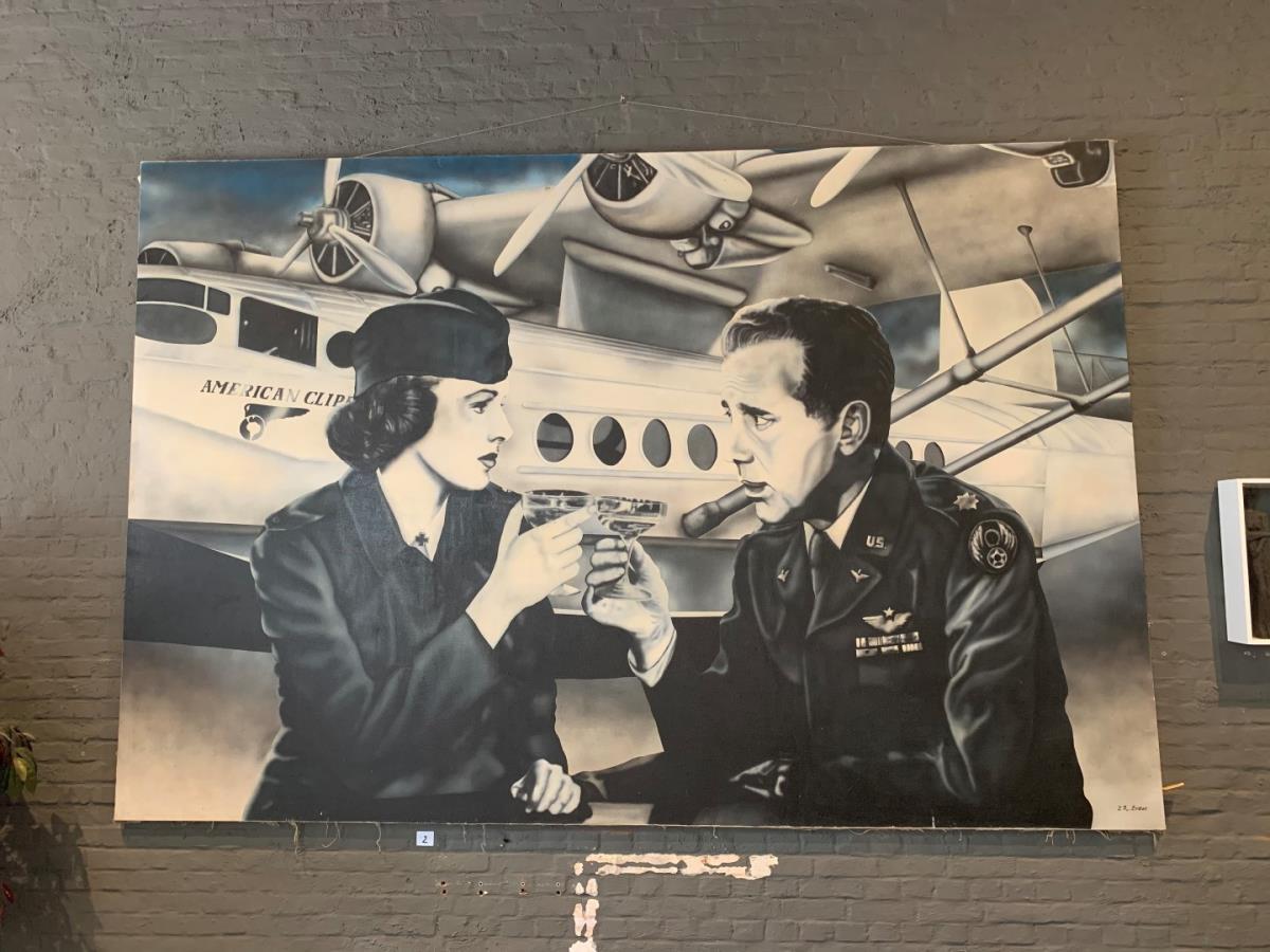 airbrush op doek, P.R.Potier, Humphrey Bogart & Ingrid Bergman in film Casablanca, 300 x 200 cm