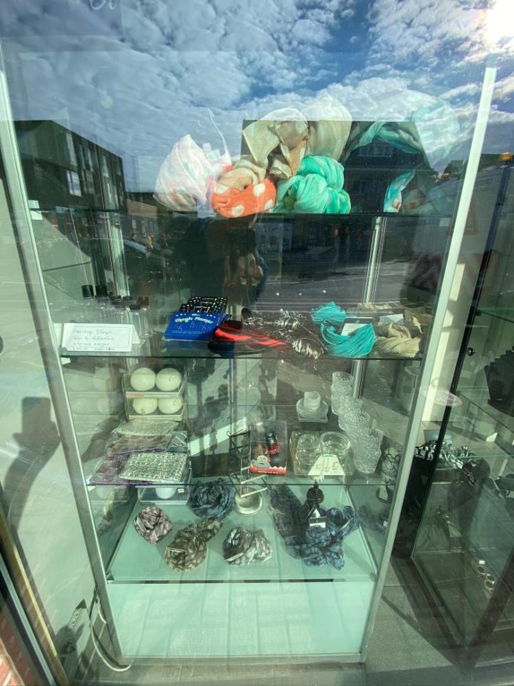 afm plm 820x400x1820mm, diverse sjaals, kaarsenhouders, kaarsjes, juwelendisplay…