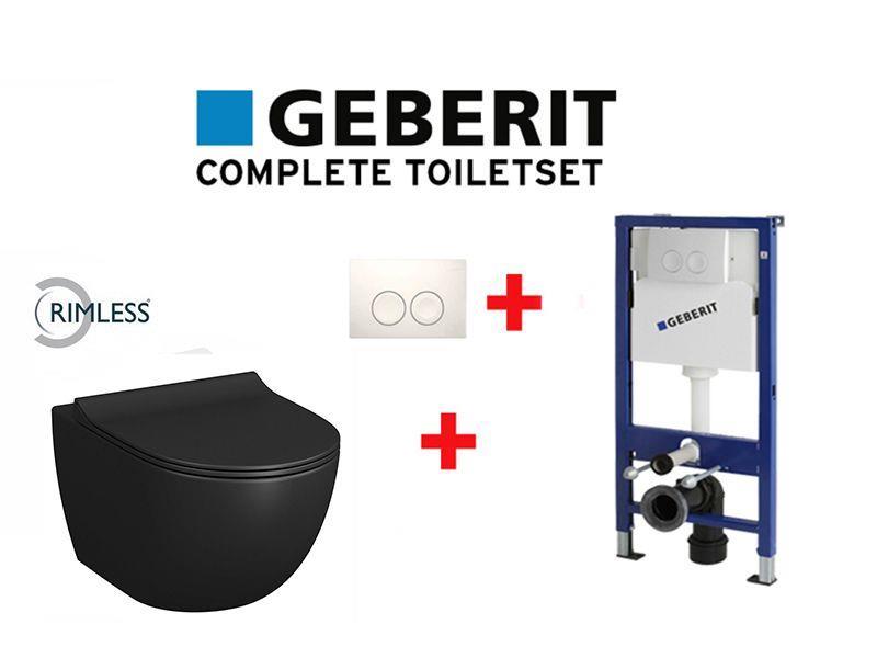 1 x Complete toiletset van Geberit bestaande uit: Geberit DuofixBasic inbouwreservoir UP100 + Geberit Delta 21 bedieningsplaat in de kleur wit + Design wandtoilet zwart; porselein rimless model; met dunne softclose en take off zitting in duroplast wit; 520 x 360 x 340 mm