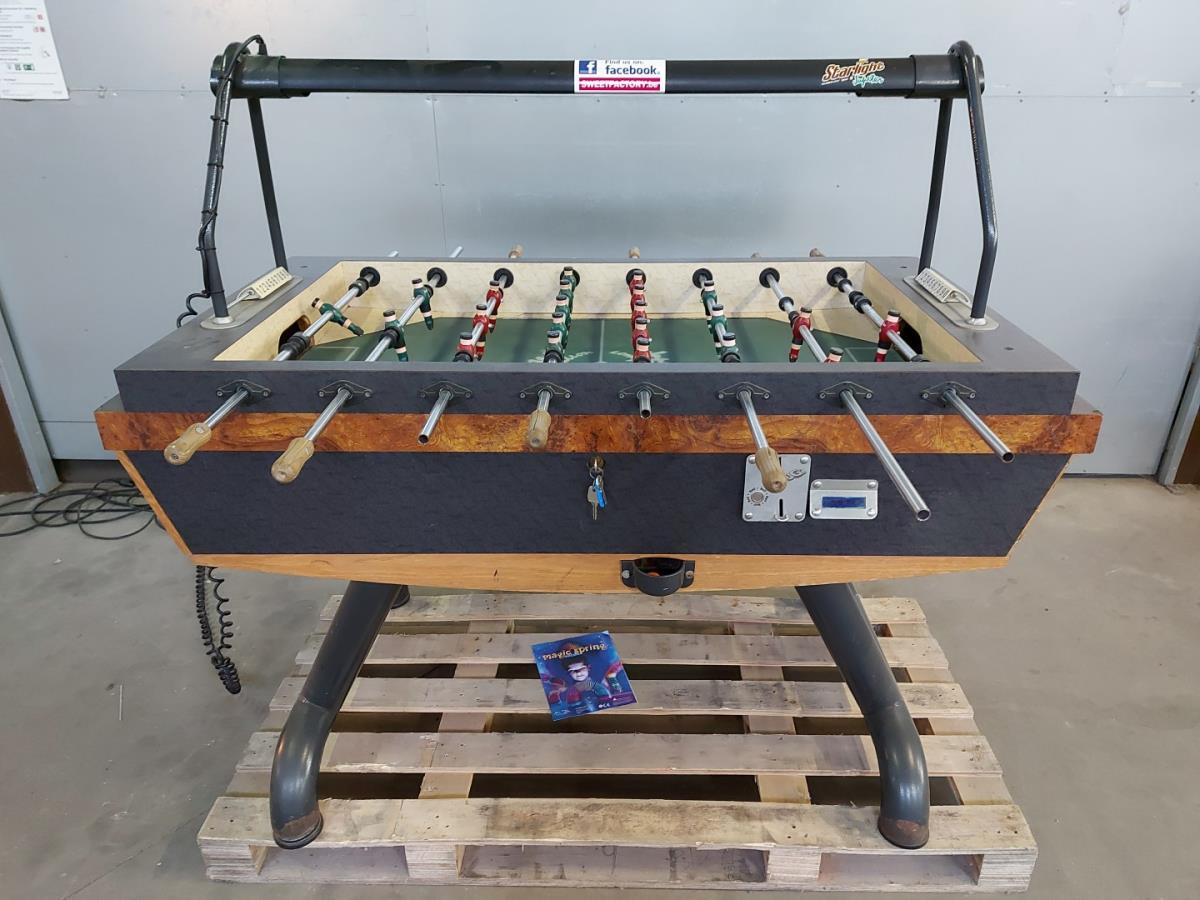Jupiter starlight voetbaltafel met electronische muntinworp, nieuwe mannetjes, lagers en staven. Ook mogelijk in te stellen op free play.