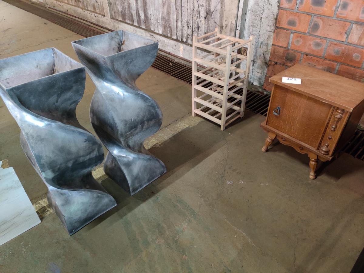 2 deco metalen zuilen + houten rek en antiek nachtkastje