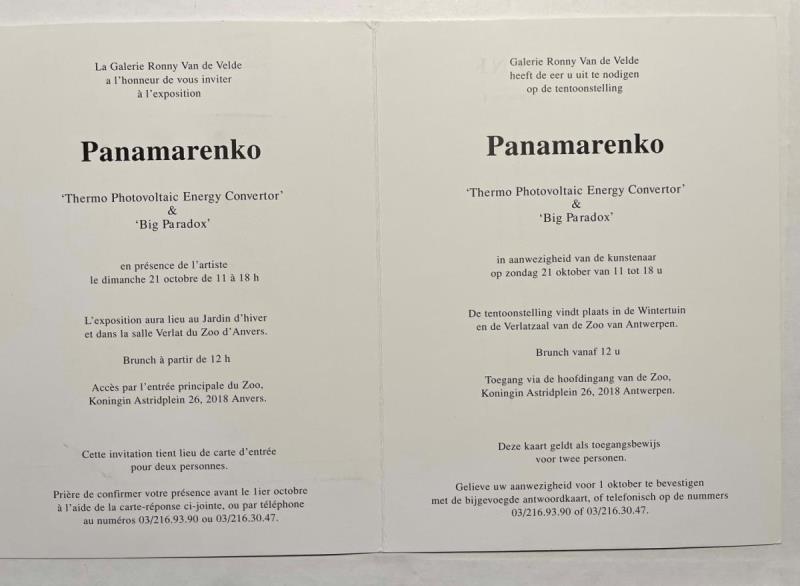Vijfkleurige kunstdruk/uitnodiging handgesigneerd door Panamarenko in zilverstift. Op bepaalde plaatsen afgewerkt met zilverinkt, exact zoals de grotere litho's en werken. Gedrukt op dik papier