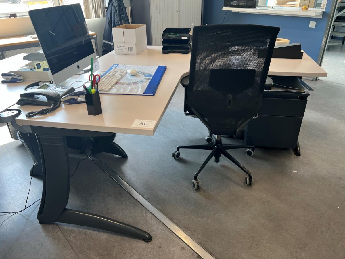 bu: l-vormig formica houten bureau, afm plm 1800x1800x740h, vv ergonomische typistestoel en ladeblok