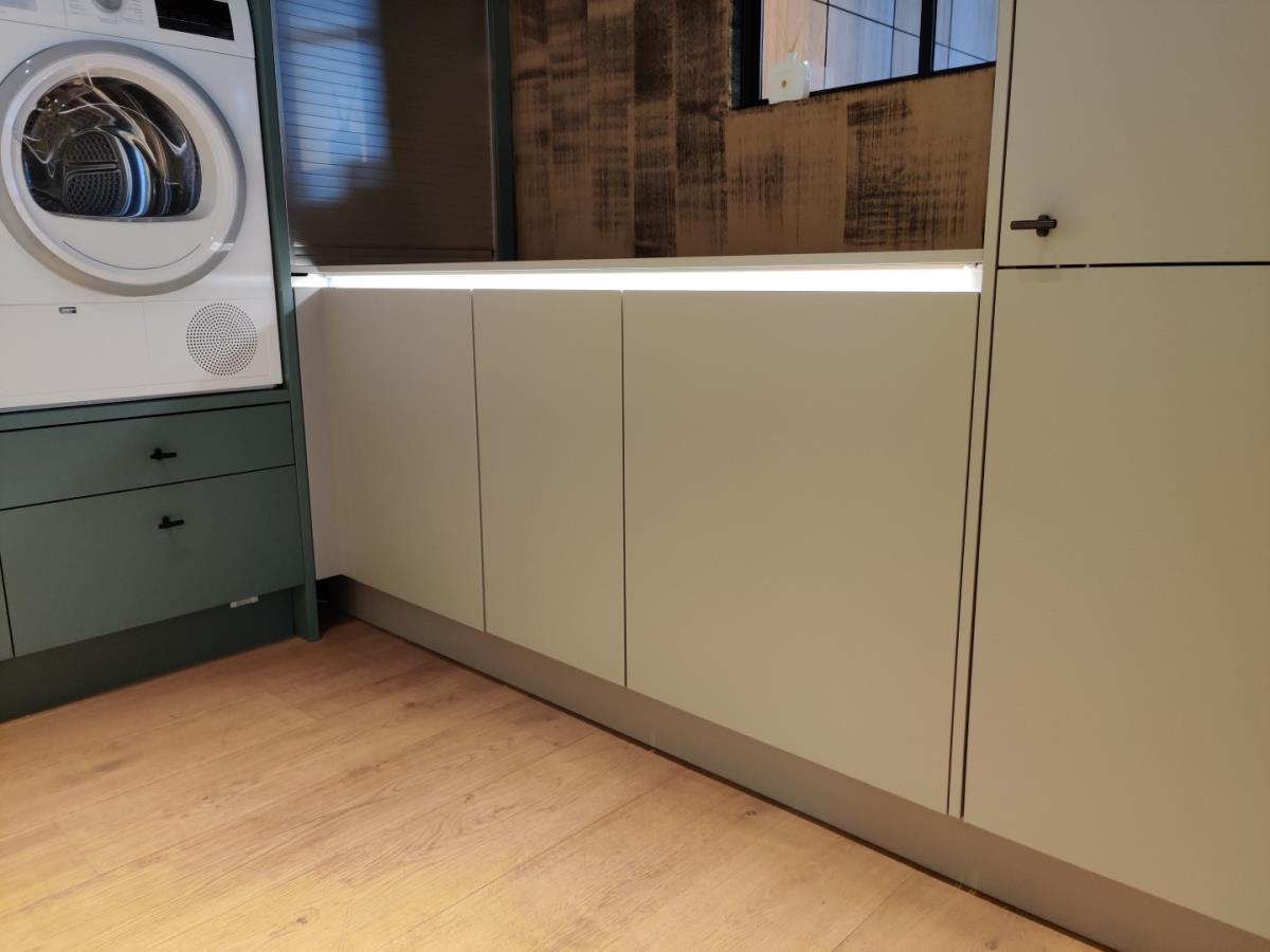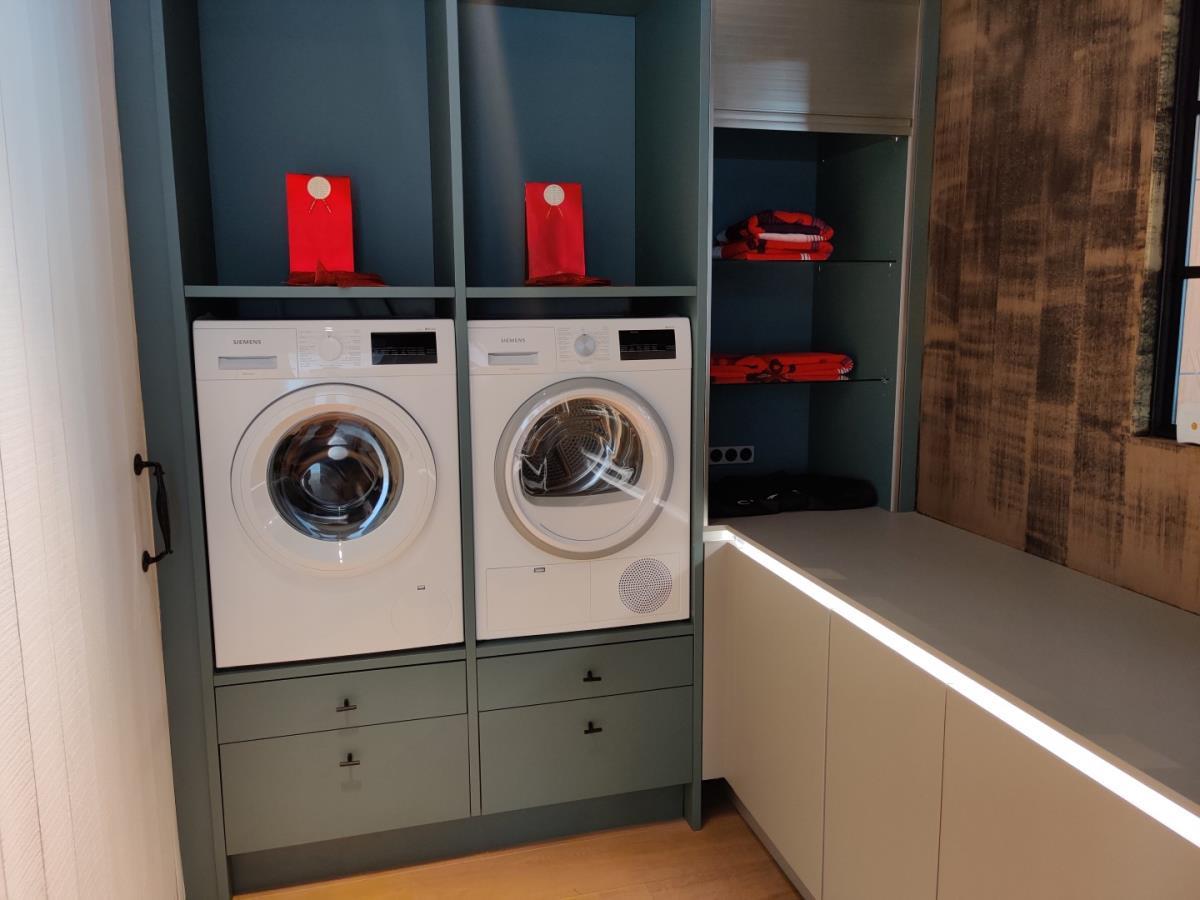 Exclusief wasmachine en droogkast. Voldoende opbergruimte, met specifieke ruimtes voor wasser en droger, onderaan deze opening vindt u uitrolbare schuiven voor het plaatsen van uw wasmand. Koper staat zelf in voor de demontage en de verplaatsing.