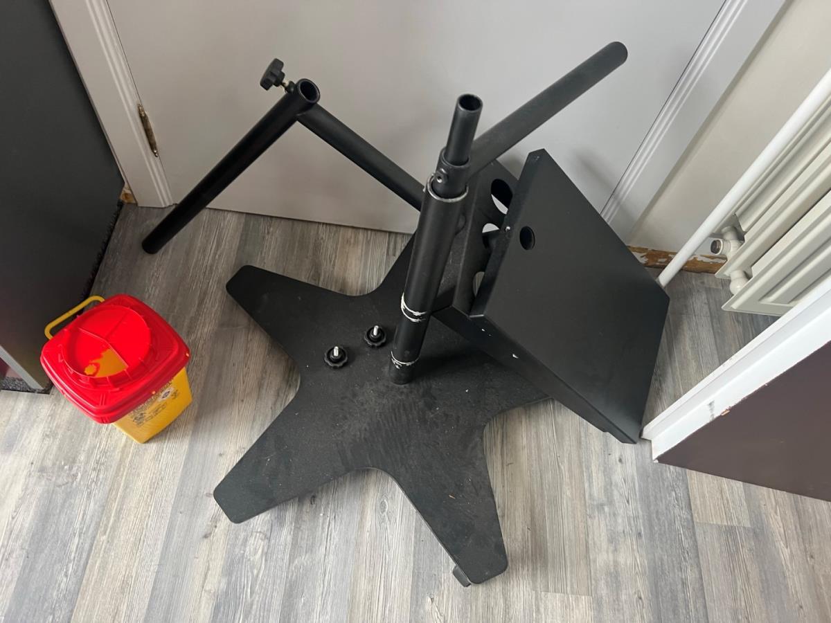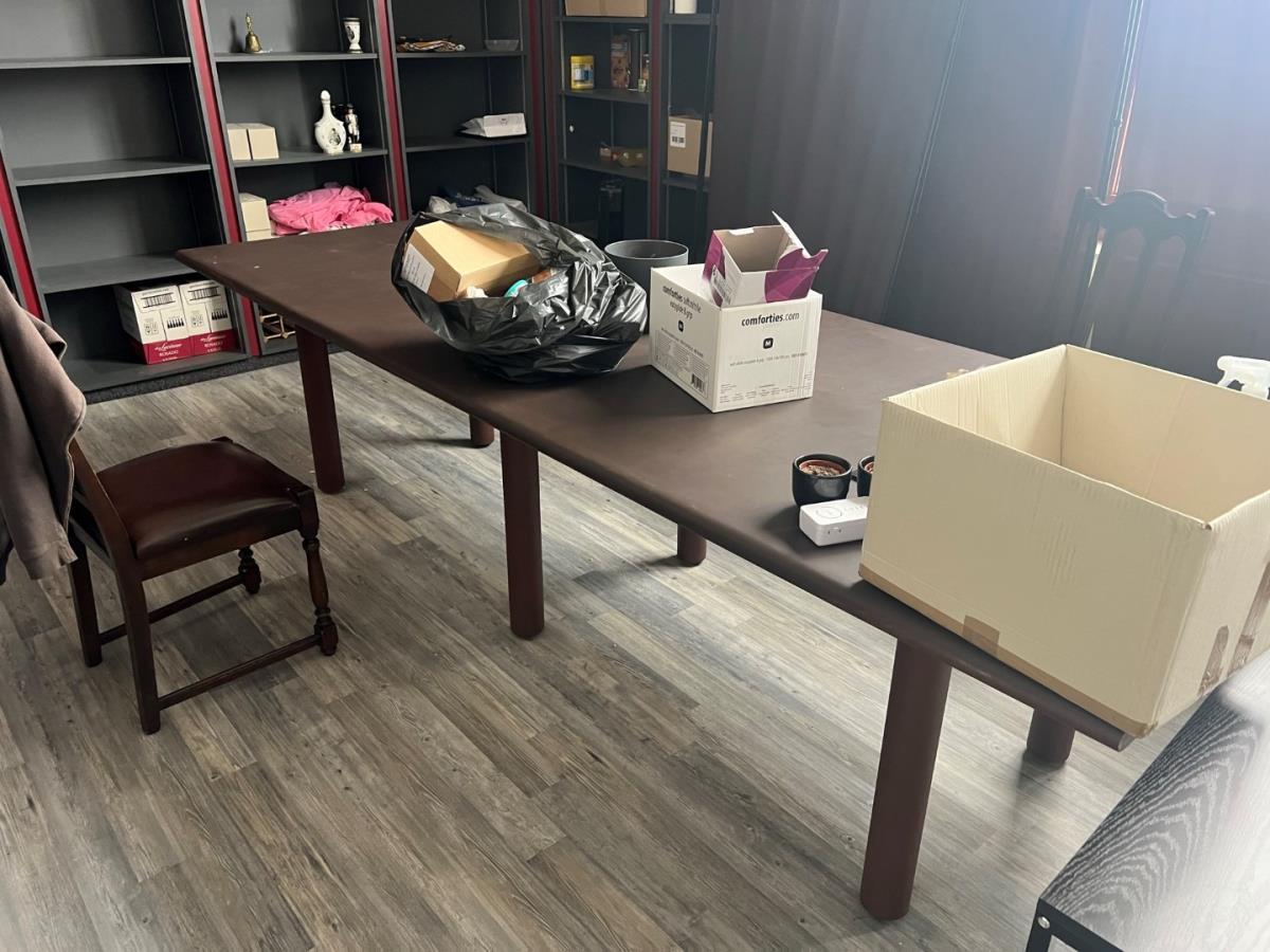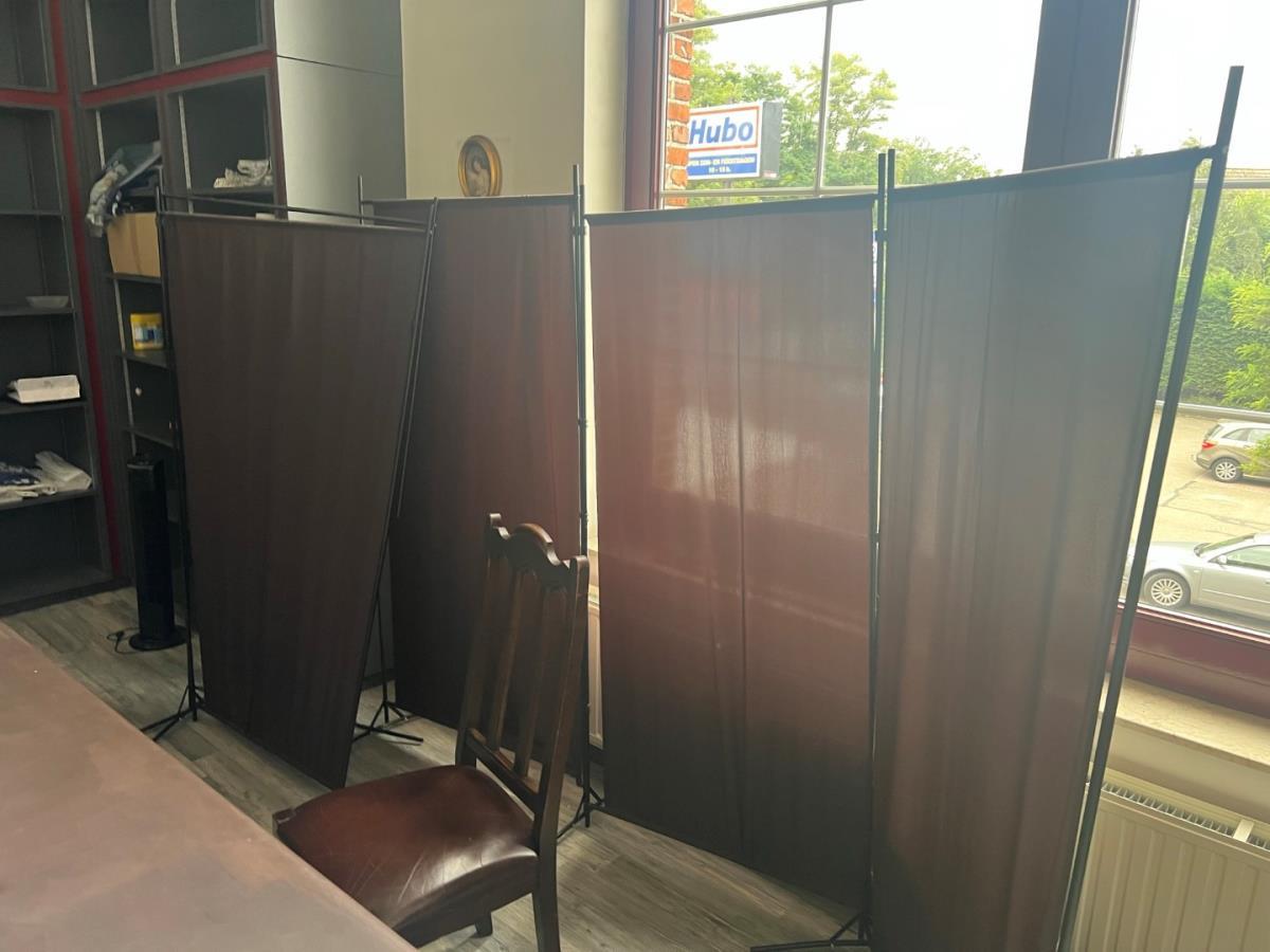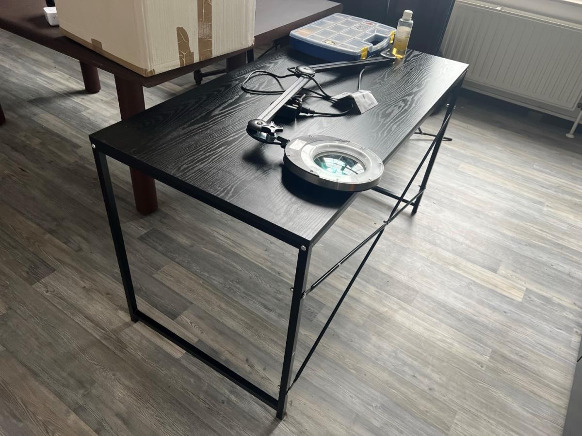 Bestaande uit: 1 grote houten tafel (plm 3mbreed), 1 Zwarte bijzettafel, scheidingswanden, loeplamp, torenventilator, diverse deco , schuimwijn, rode wijn, bier (ongeopend) Tattoo inkt, 2 houten stoelen, ipad houder en andere. Grote tafel zal een 3 meter breed zijn