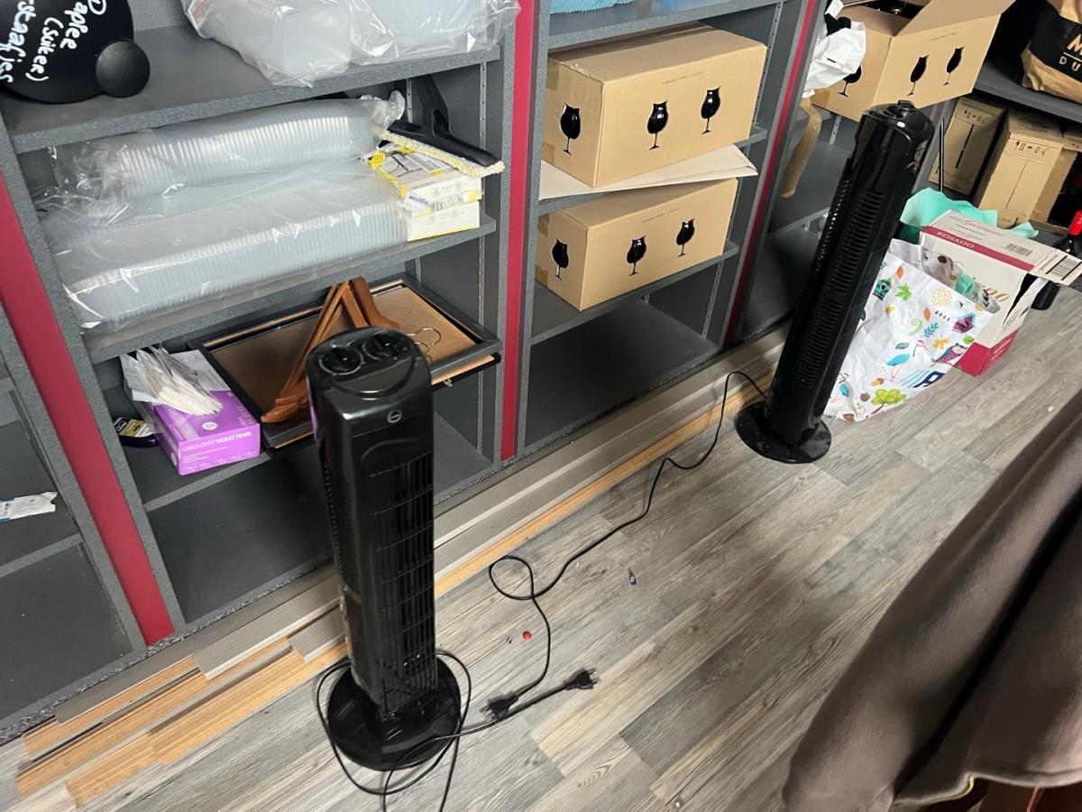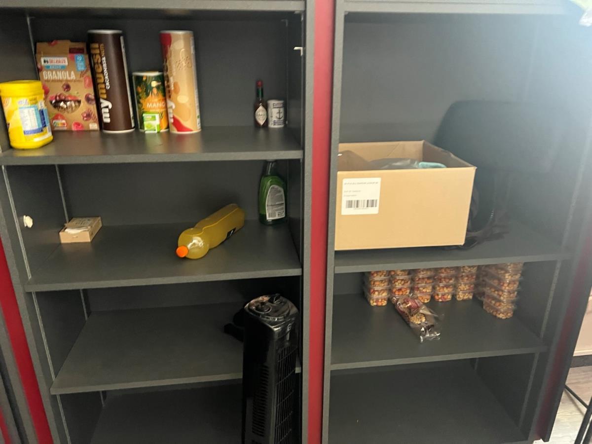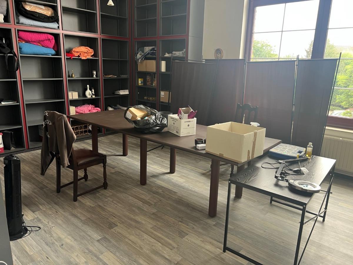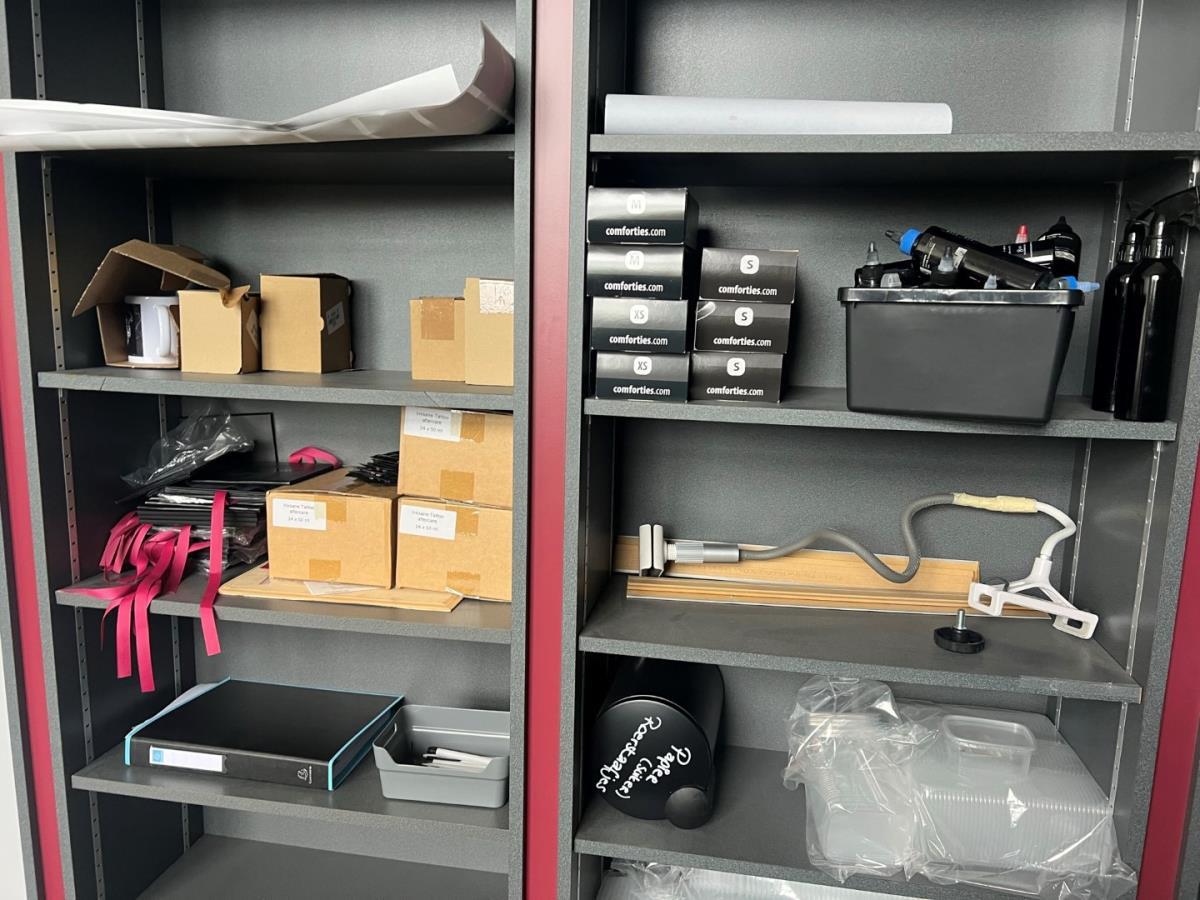 Bestaande uit: 1 grote houten tafel (plm 3mbreed), 1 Zwarte bijzettafel, scheidingswanden, loeplamp, torenventilator, diverse deco , schuimwijn, rode wijn, bier (ongeopend) Tattoo inkt, 2 houten stoelen, ipad houder en andere. Grote tafel zal een 3 meter breed zijn