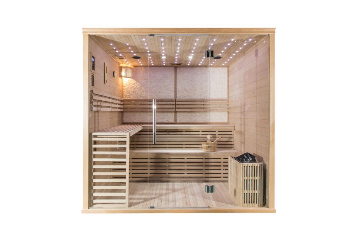 1x Luxueus ingerichte traditionele sauna; model: premium, 03, houtsoort: Canada hemlock, met led sfeer verlichting, vol glas voorkant 8 mm veiligheidsglas, rvs heather en digitaal controller, thermometer en hygrometer, glazen timer, lava steen, geschikt voor 5-6 personen, Uitsluitend samgensteld uit de beste materialen, afm: 220x200x210cm (l x b x h). ongebruikt;
