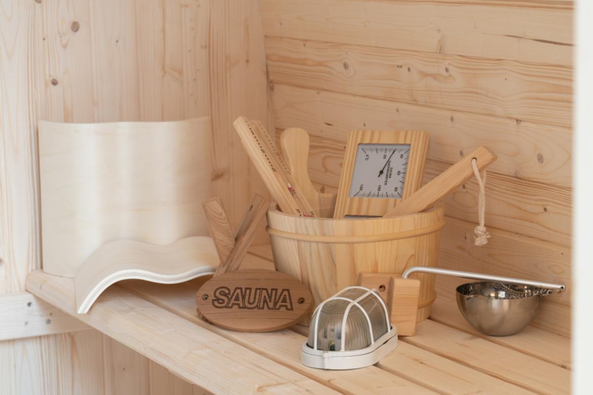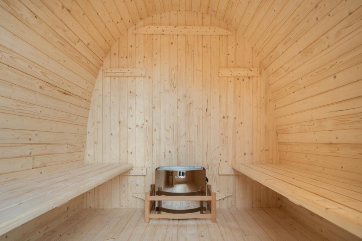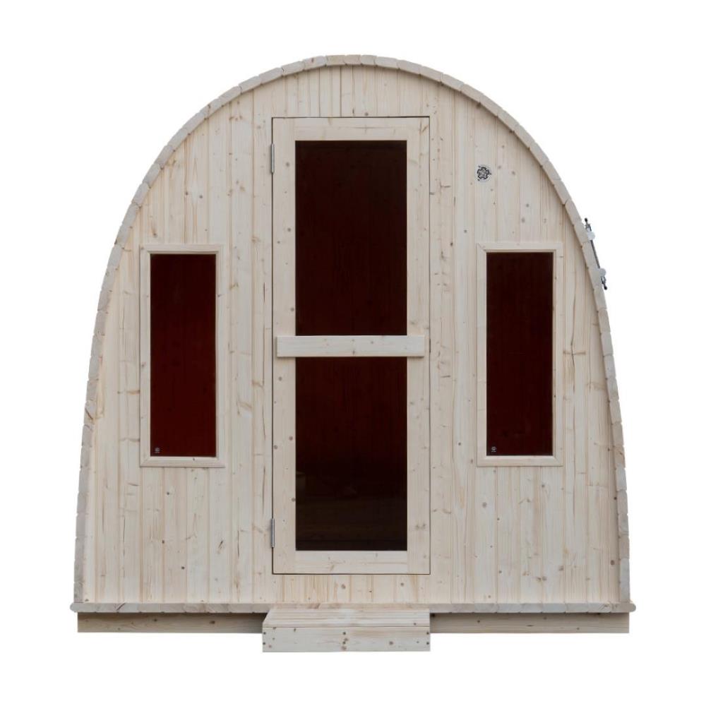 1x Pod sauna met getint glas, houtsoort: Finland Pine; geschikt voor 4-5 personen; inclusief: thermometer, hygrometer, glazen zandloper, hoofdsteun, glazen sauna deur, 6KW kachel 'Harvia', afmetingen: 2100x2100mm