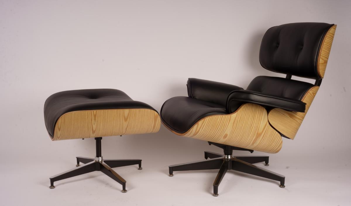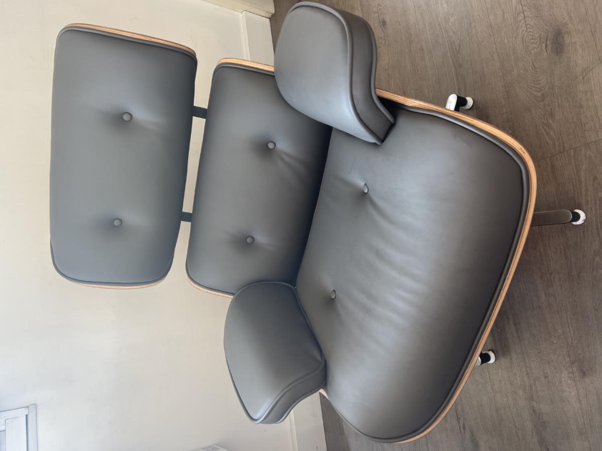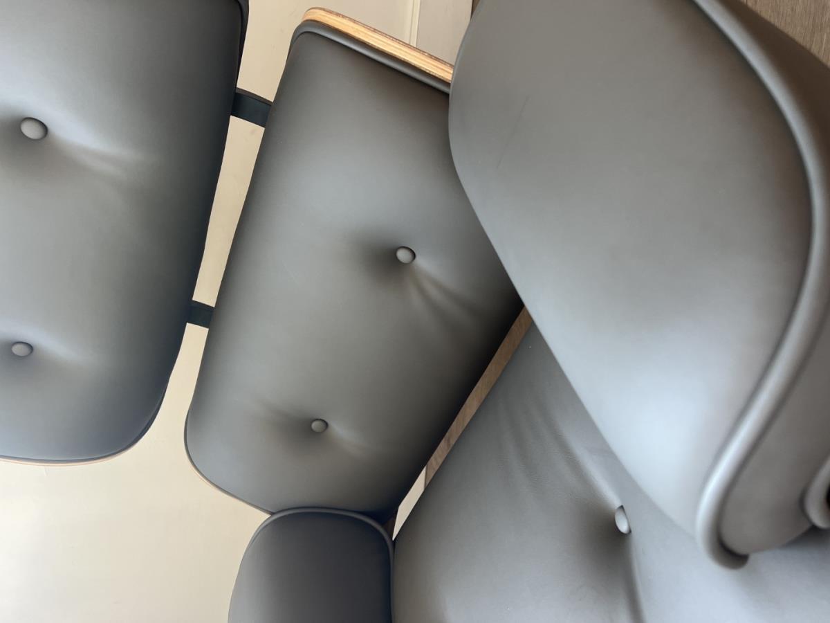 1x design fauteuil met bijhorende voetbank grijs, afmeting fauteuil: circa 93x88x70cm, afmeting voetbank: circa 65x55x45, eigenschappen: echt leder, romp in rose wood, alu frame, sterpoot met verstelbare poten; goed om te weten: ongebruikt en in verpakking
